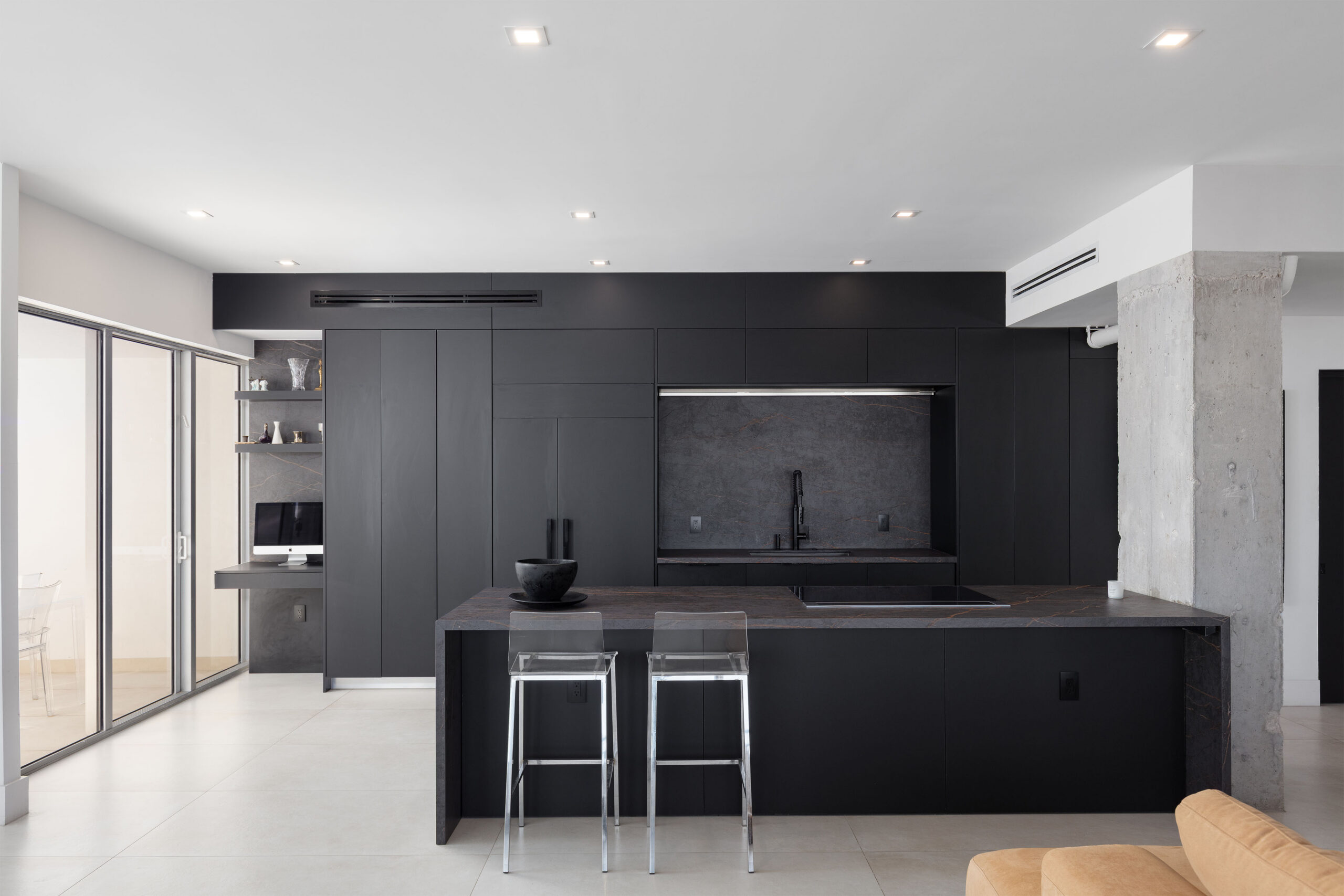 The interior opens into the living room, where floor-to-ceiling windows frame panoramic bay and skyline views while allowing natural light deep into the space. Sliding doors open fully, creating seamless indoor/outdoor flow to the main terrace. The island kitchen is finished with Dekton solid surface countertops and matte European cabinetry. Appliances include Wolf ovens and stove top, Miele dishwasher, and 2 Sub Zero refrigerators and freezers, with one pair incorporated into the custom cabinetry and the other set integrated into the kitchen island alongside the Wolf stovetop and oven. The configuration maintains clear sightlines to the water while allowing direct access to the secondary terrace for outdoor dining. The primary bedroom is oriented toward the water and skyline, continuing the residence’s emphasis on view, air and light.