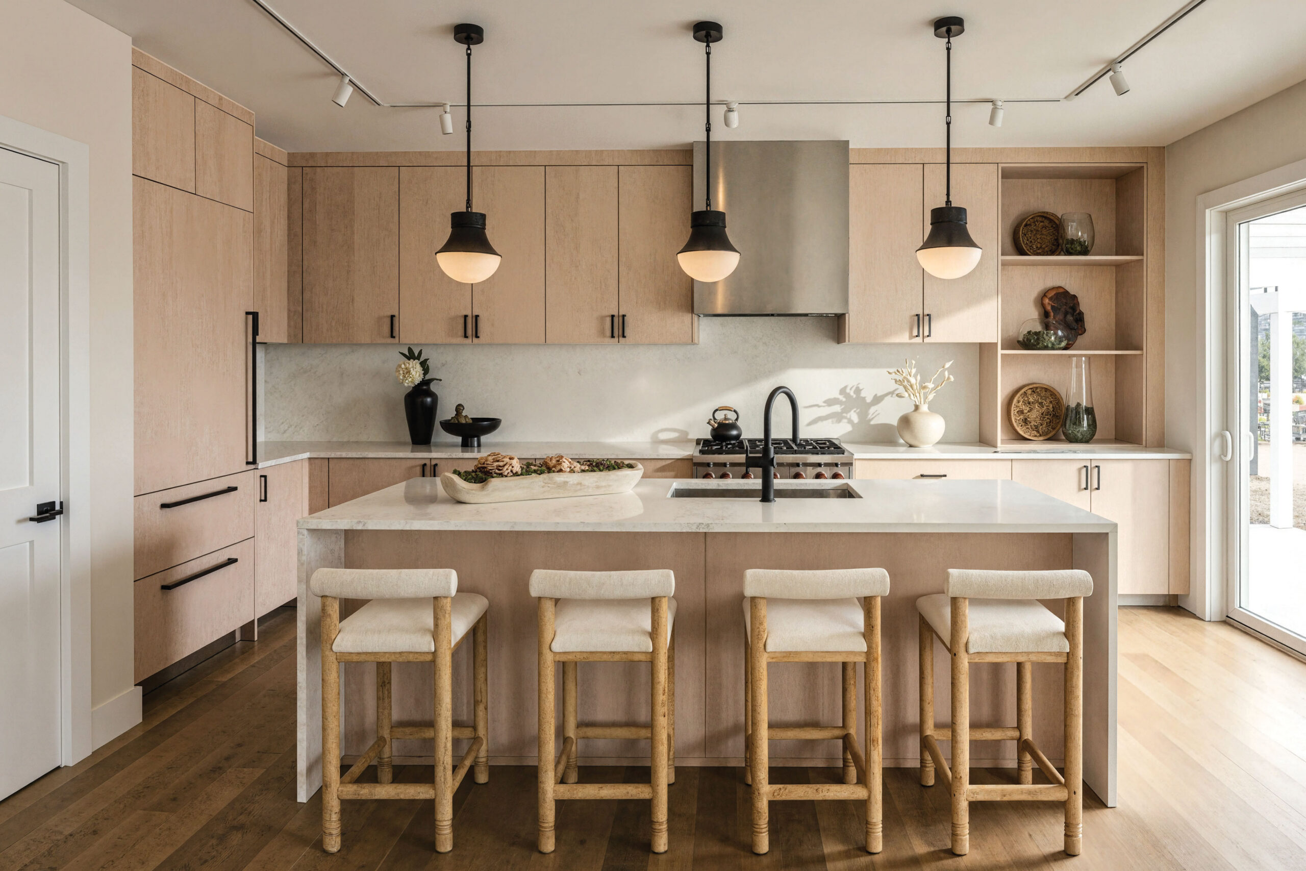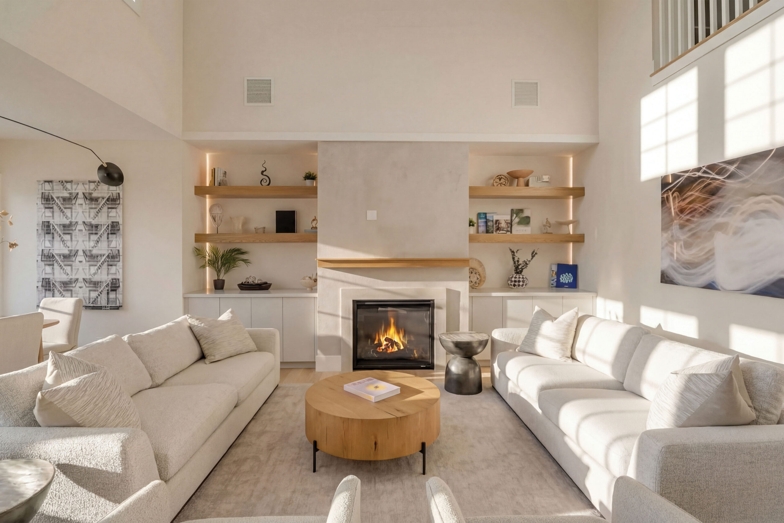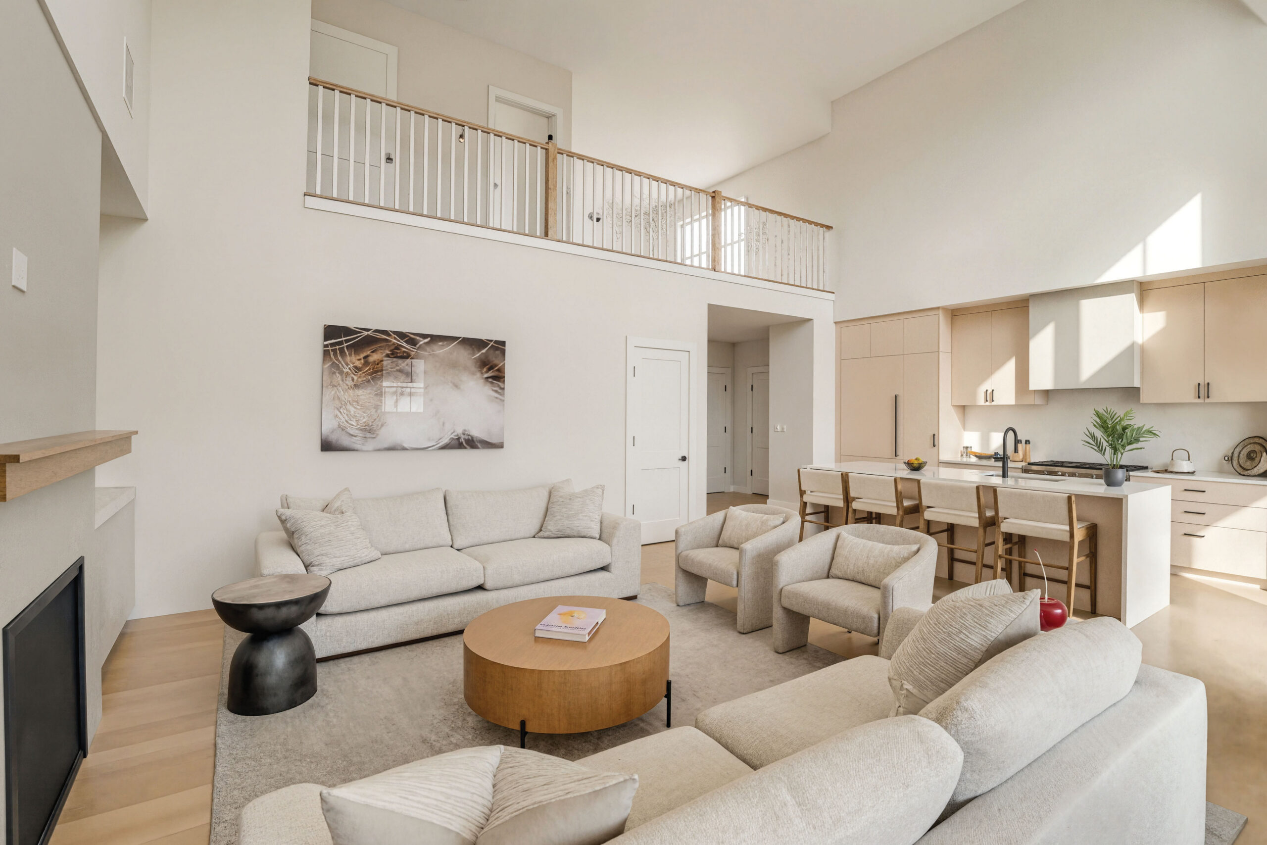 The home features 2 bedrooms, 2 full, and 1 half bathrooms, thoughtfully arranged within a modern open-concept layout. 9’ ceilings, oversized Andersen windows and doors, and wide-plank white oak hardwood flooring create a bright and airy atmosphere throughout. The main living space is centered around a gas fireplace, providing a warm focal point for the living and dining areas. The designer kitchen is appointed with Porcelanosa millwork and tile, complemented by Sub-Zero refrigeration and Wolf professional-grade cooking appliances, combining timeless design with exceptional performance.