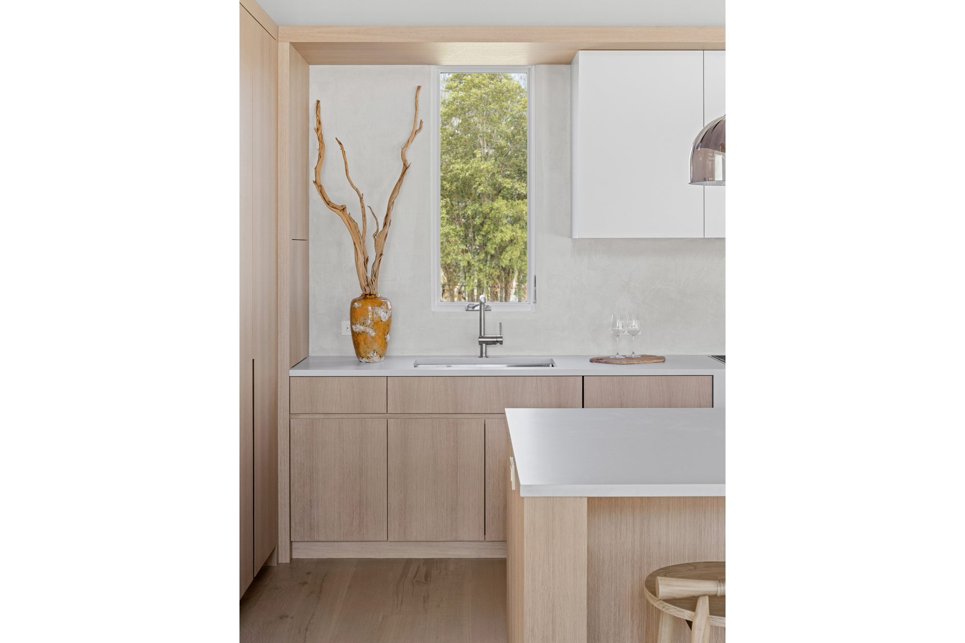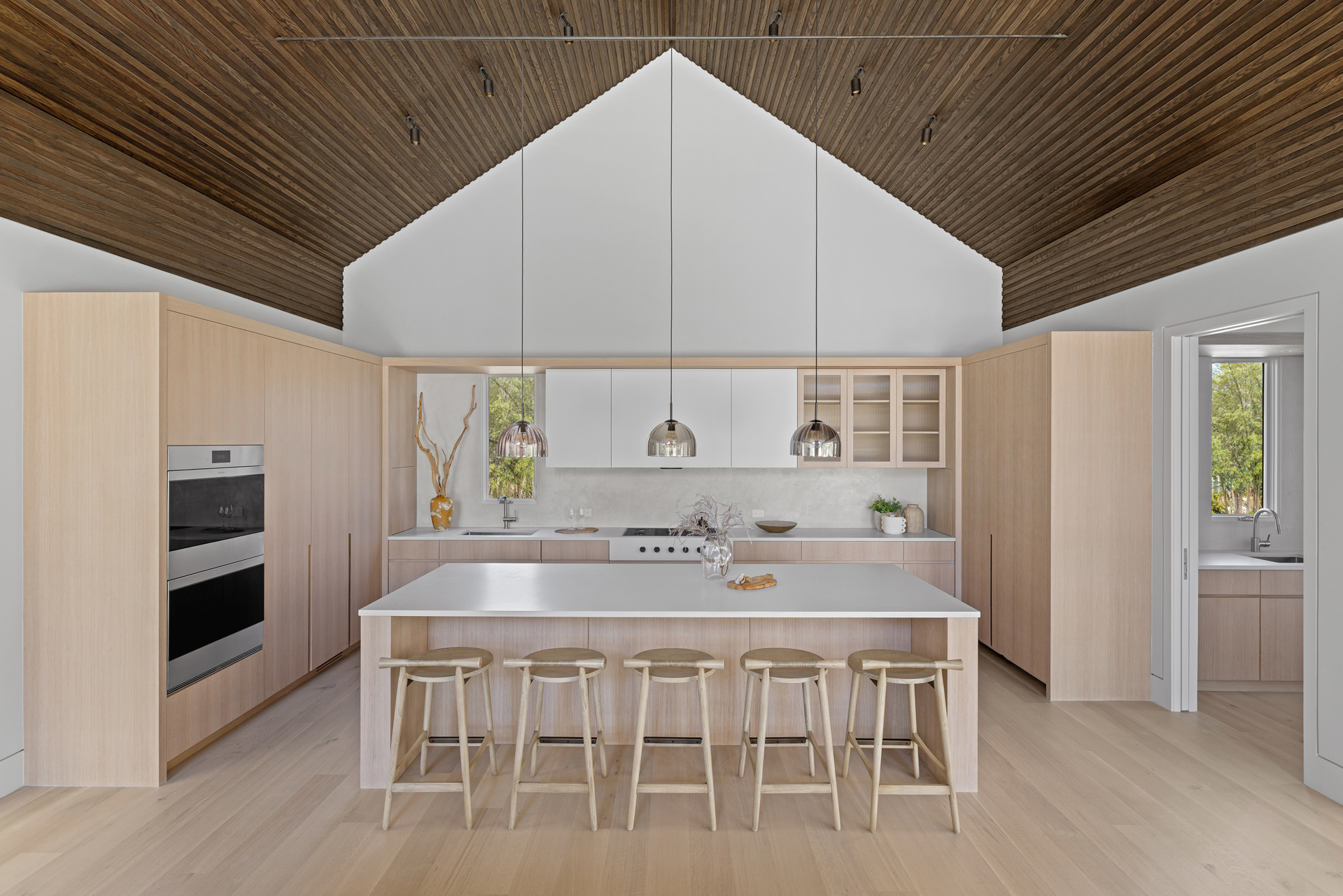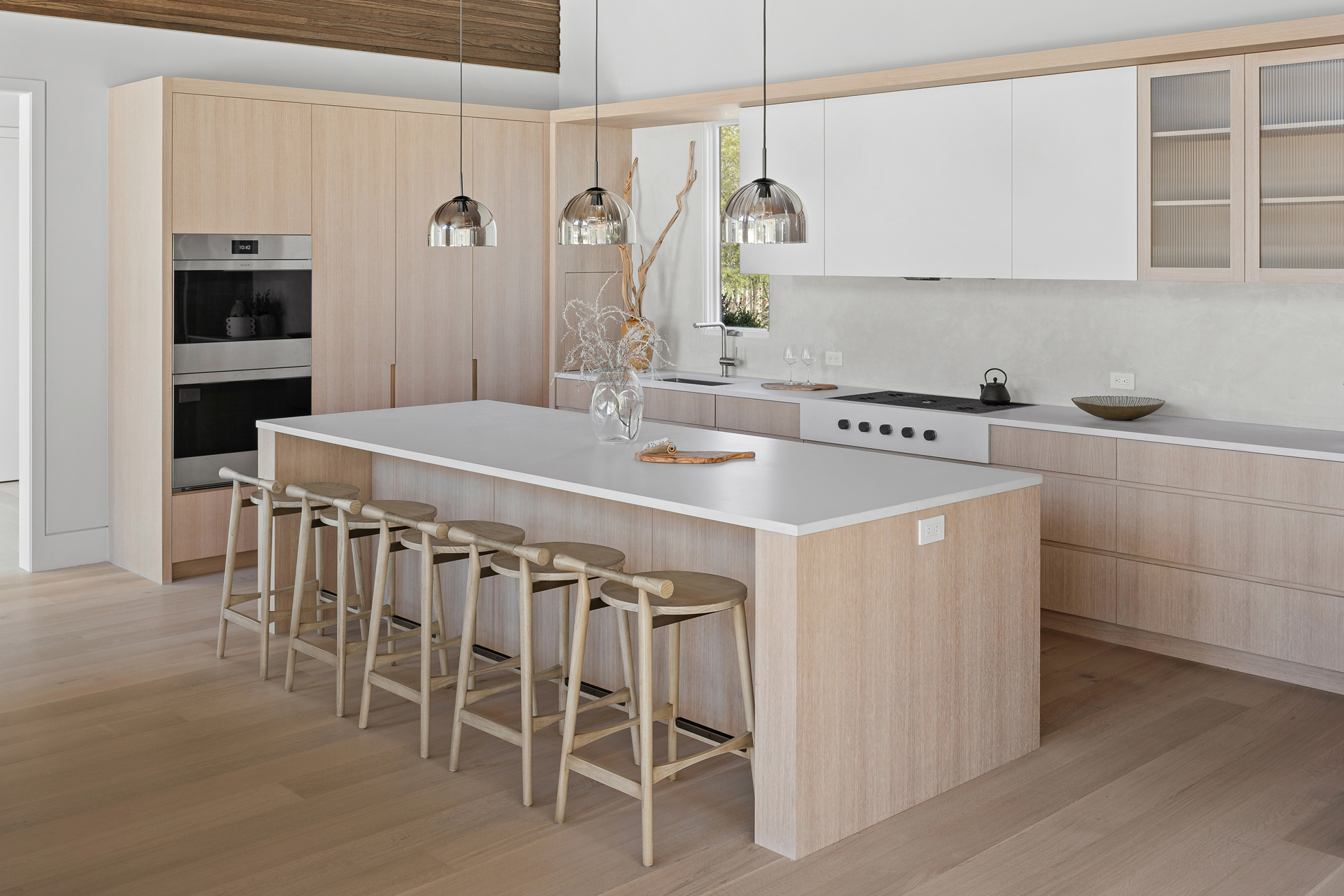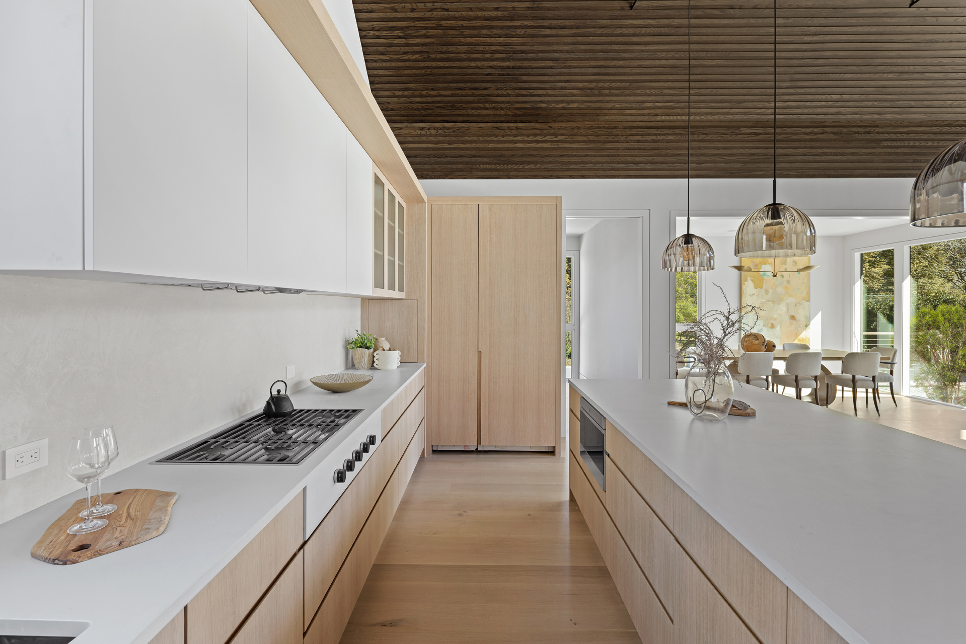 The interior of the home reflects exceptional attention to detail, where each element is thoughtfully designed for both beauty and practicality. The 7” rustic white oak flooring flows throughout, pairing seamlessly with custom Italian plaster walls in the bathrooms, kitchen, and living areas. High ceilings and slim-line aluminum windows invite natural light, enhancing the home’s open, airy feel.