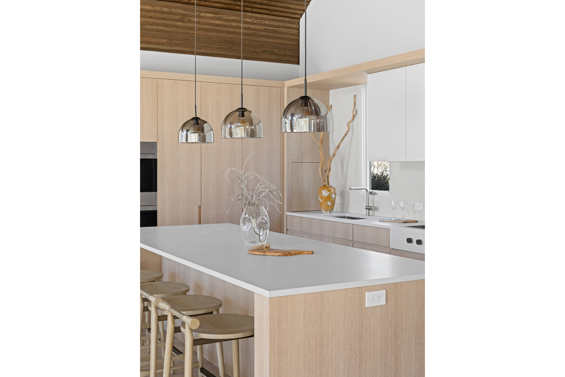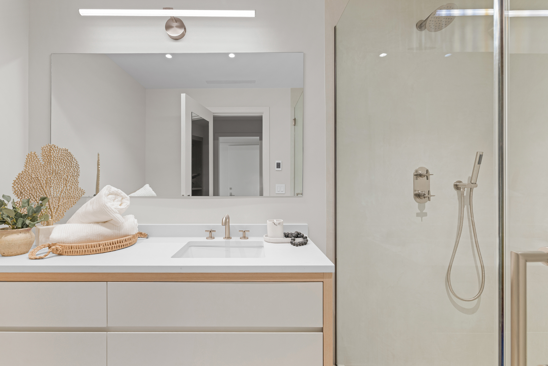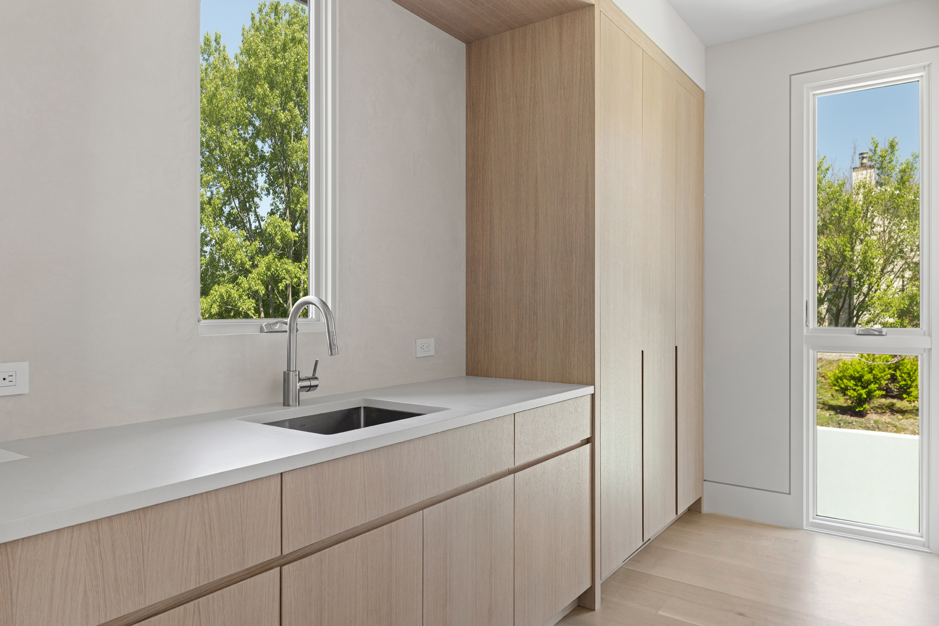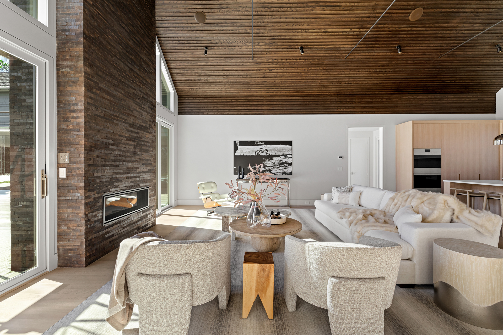 The interior of the home reflects exceptional attention to detail, where each element is thoughtfully designed for both beauty and practicality. The 7” rustic white oak flooring flows throughout, pairing seamlessly with custom Italian plaster walls in the bathrooms, kitchen, and living areas. High ceilings and slim-line aluminum windows invite natural light, enhancing the home’s open, airy feel.
