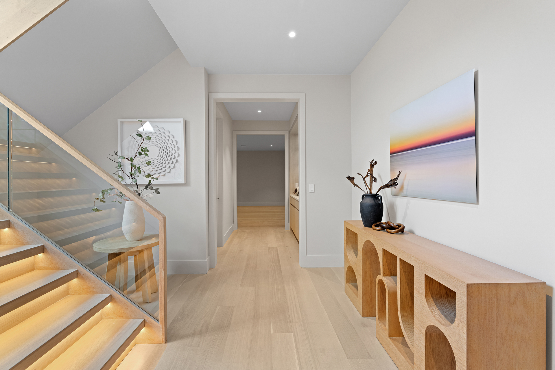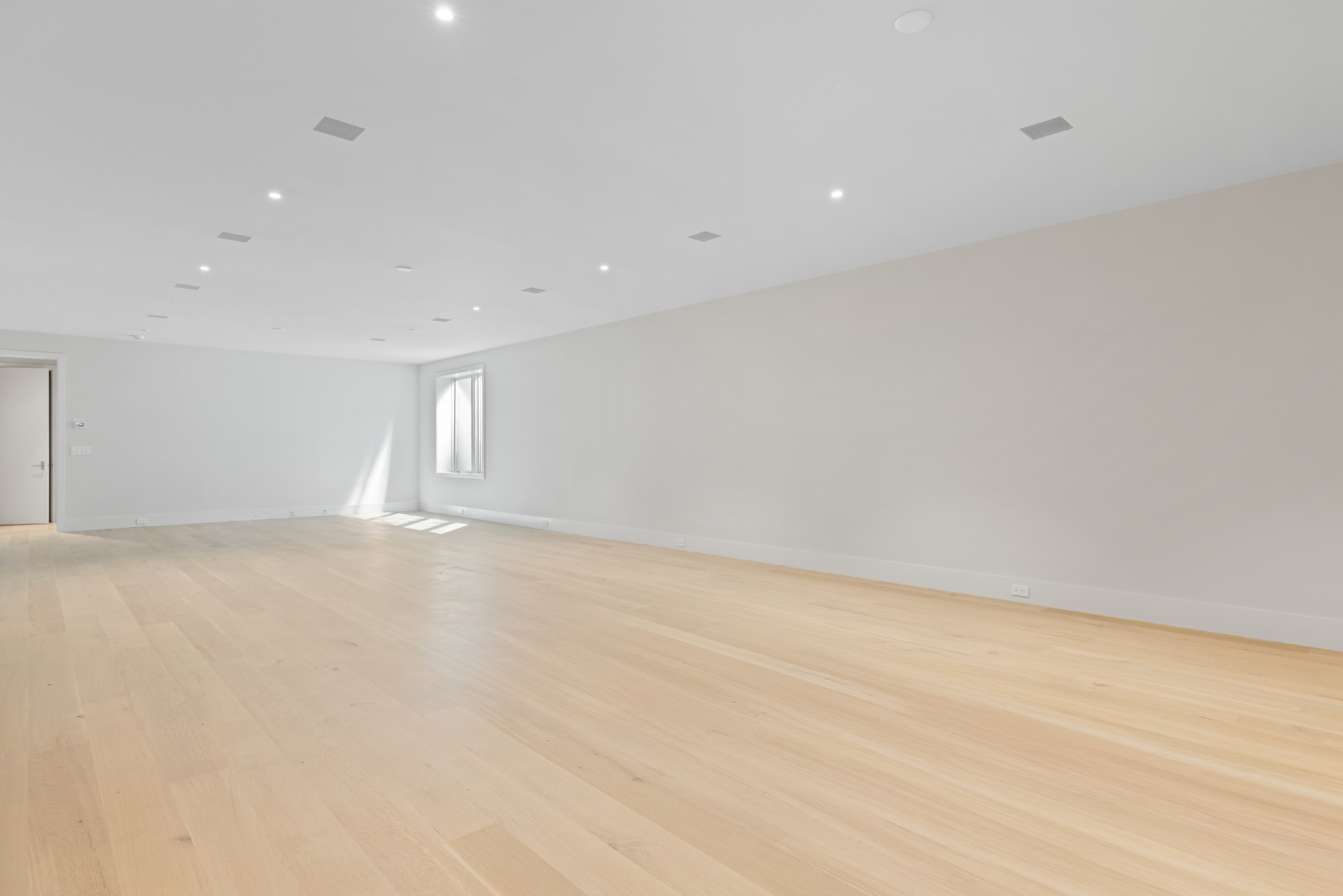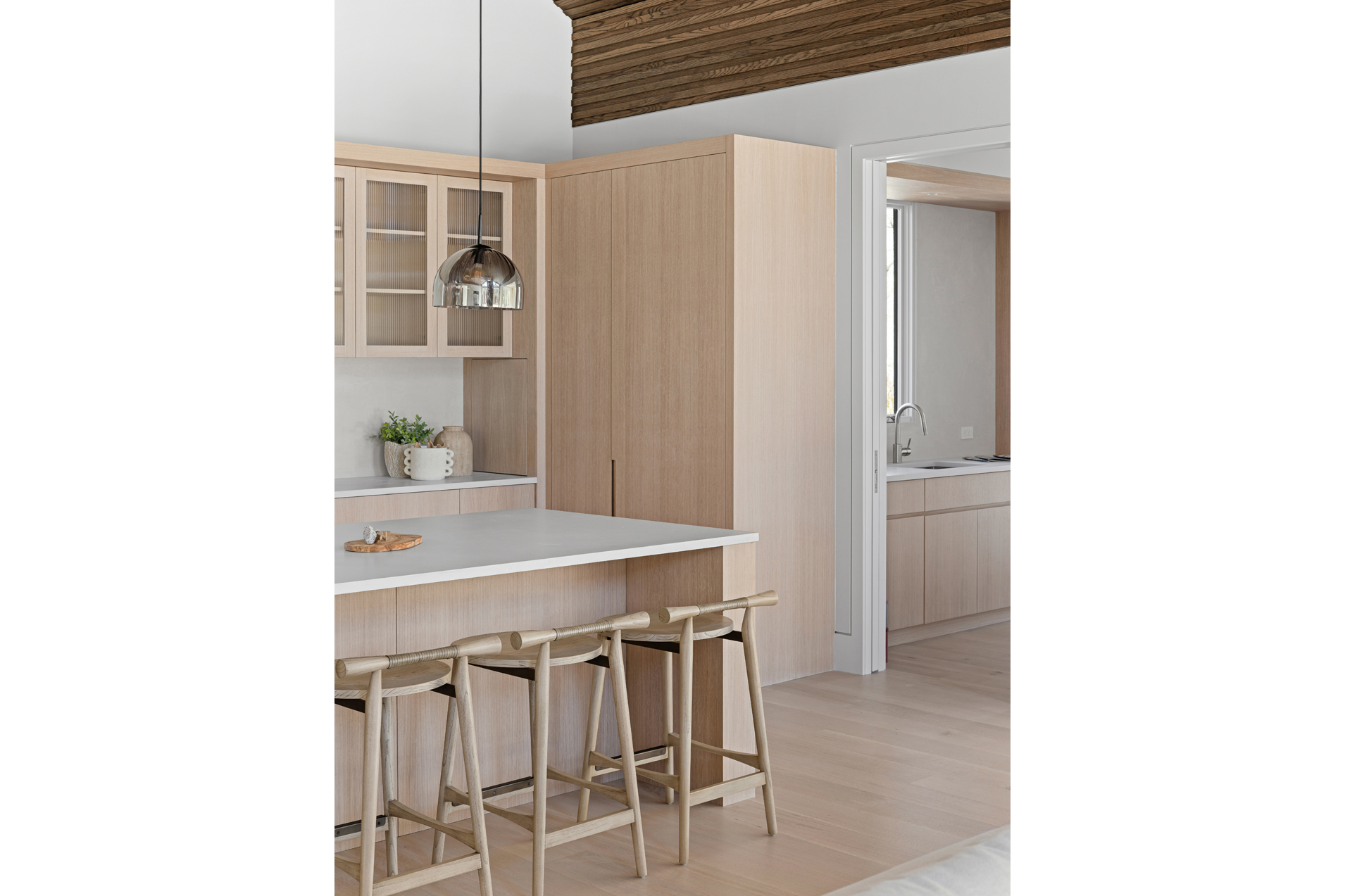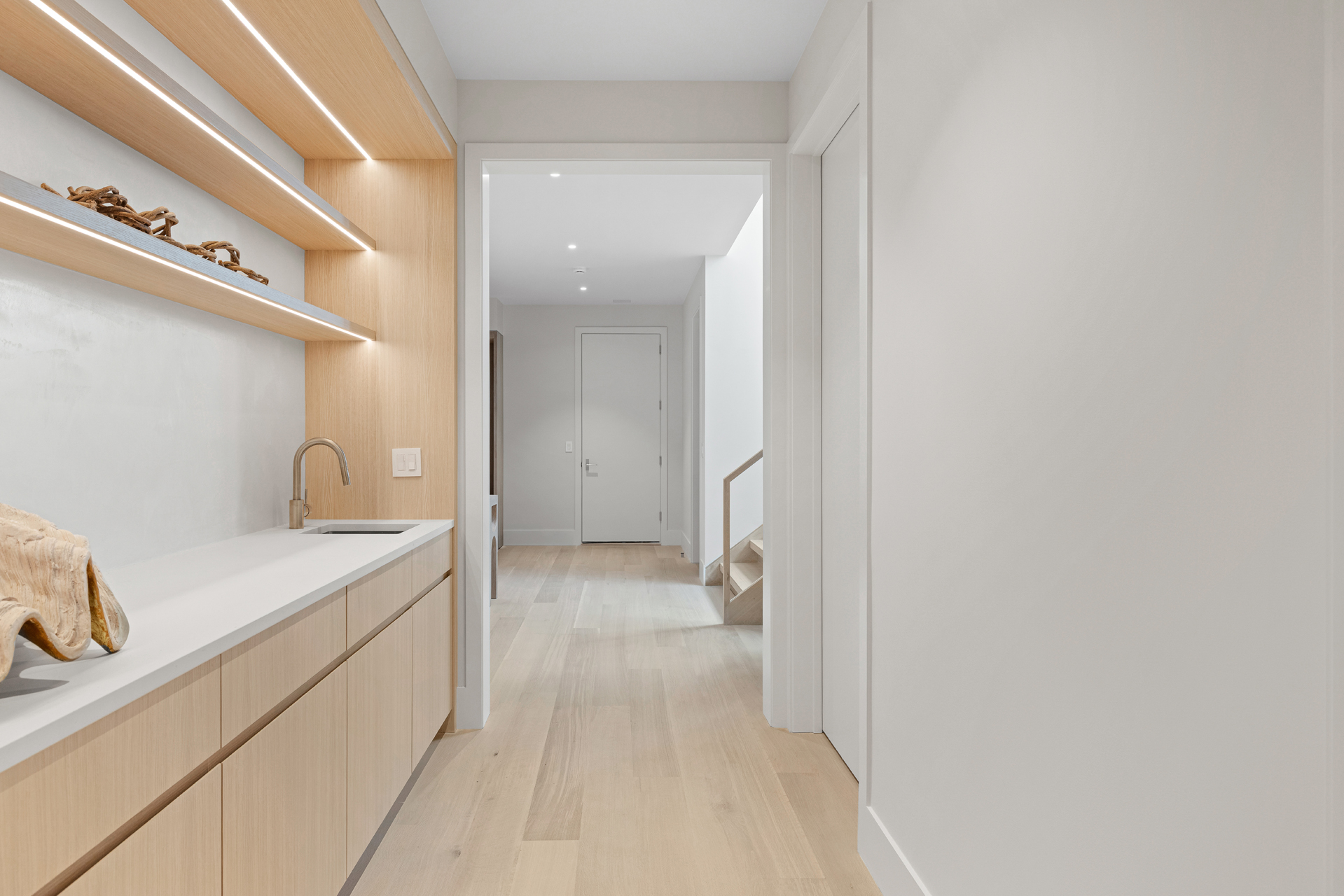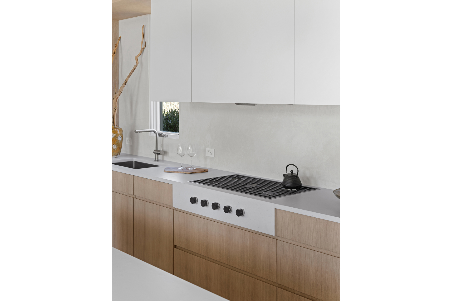 The interior of the home reflects exceptional attention to detail, where each element is thoughtfully designed for both beauty and practicality. The 7” rustic white oak flooring flows throughout, pairing seamlessly with custom Italian plaster walls in the bathrooms, kitchen, and living areas. High ceilings and slim-line aluminum windows invite natural light, enhancing the home’s open, airy feel.