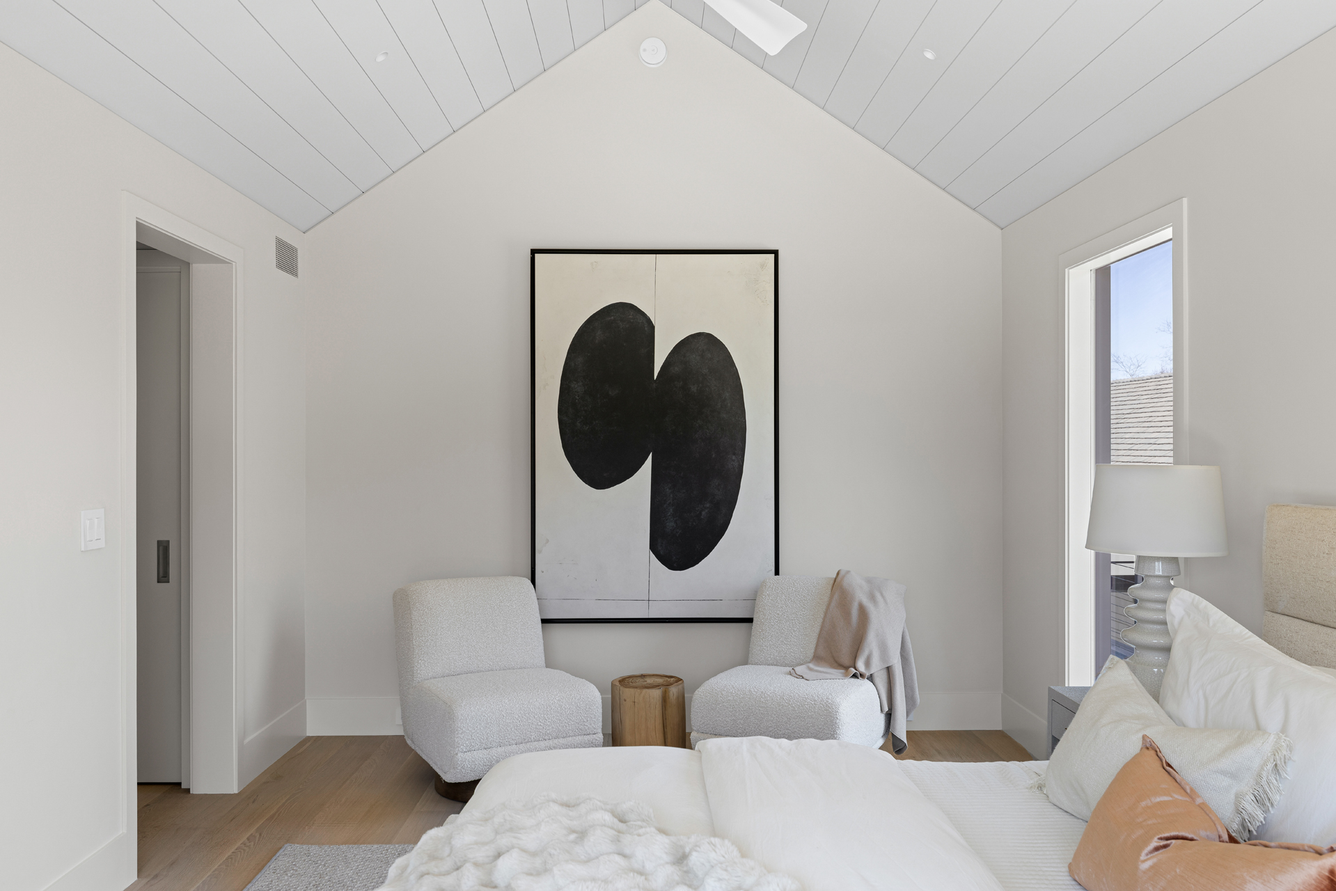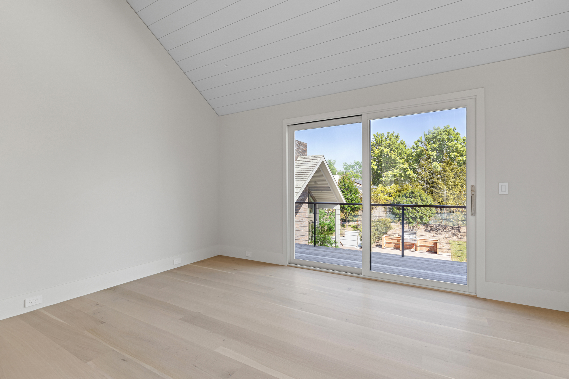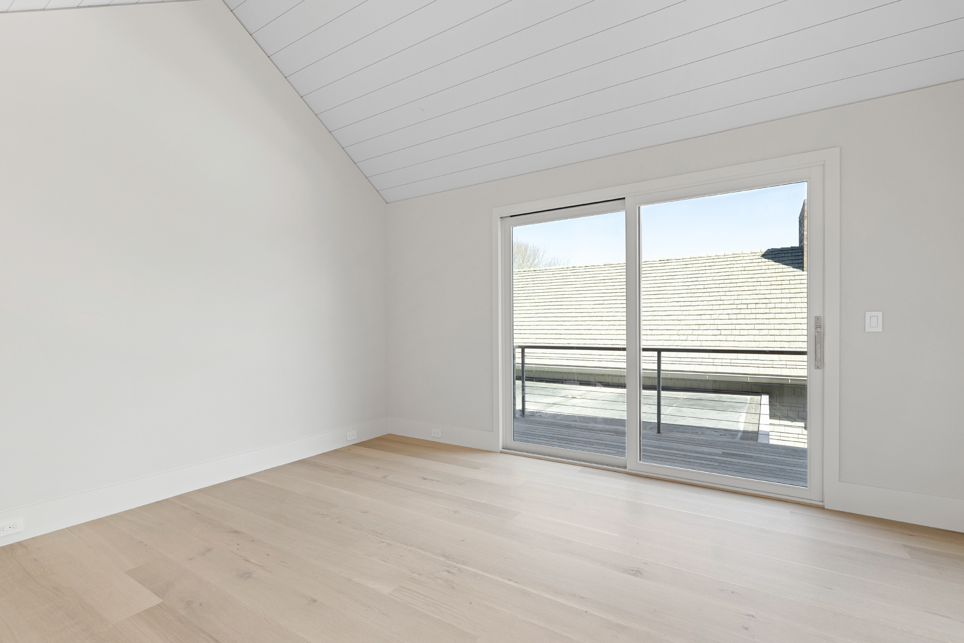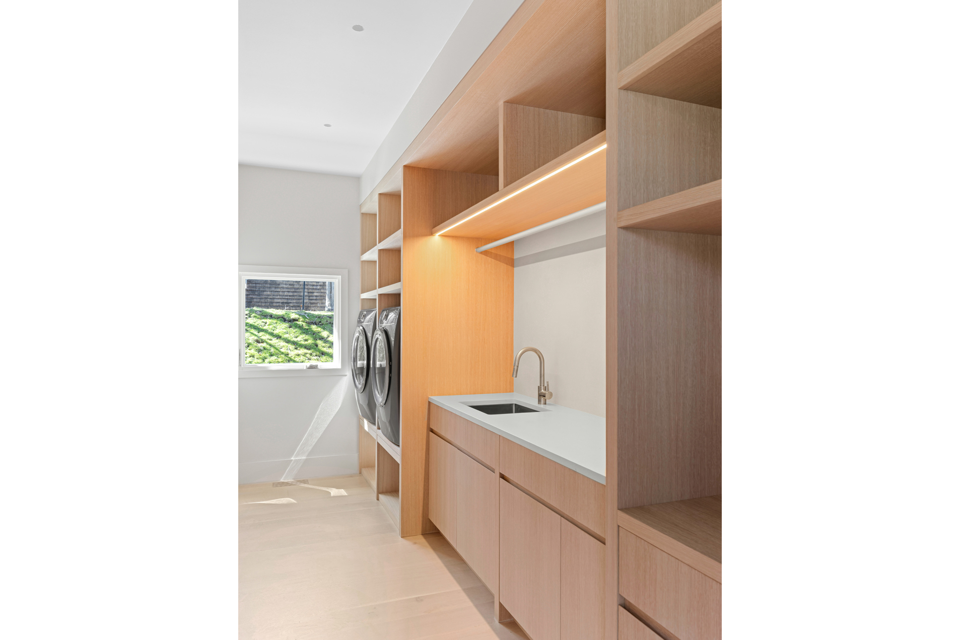The interior of the home reflects exceptional attention to detail, where each element is thoughtfully designed for both beauty and practicality. The 7” rustic white oak flooring flows throughout, pairing seamlessly with custom Italian plaster walls in the bathrooms, kitchen, and living areas. High ceilings and slim-line aluminum windows invite natural light, enhancing the home’s open, airy feel.