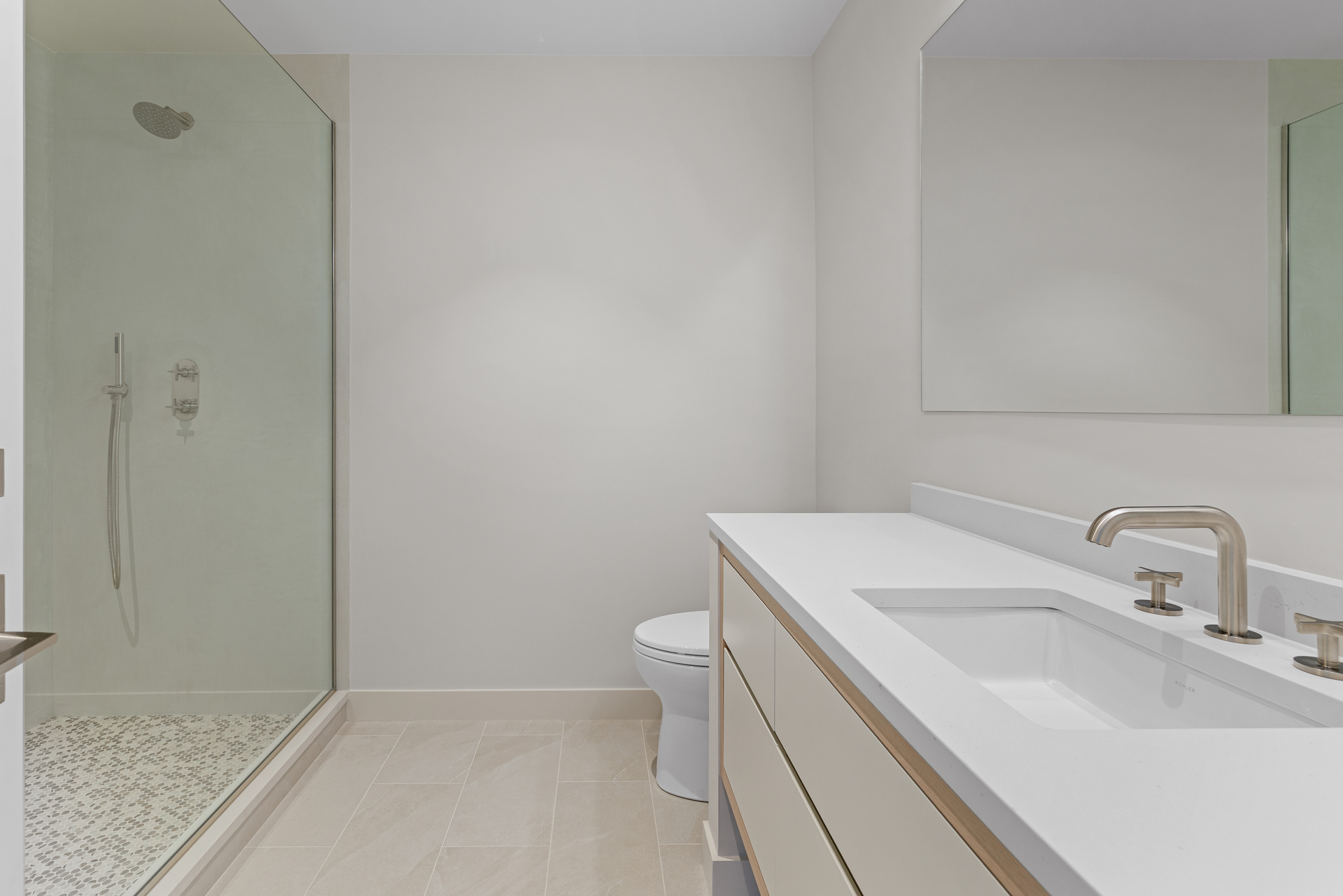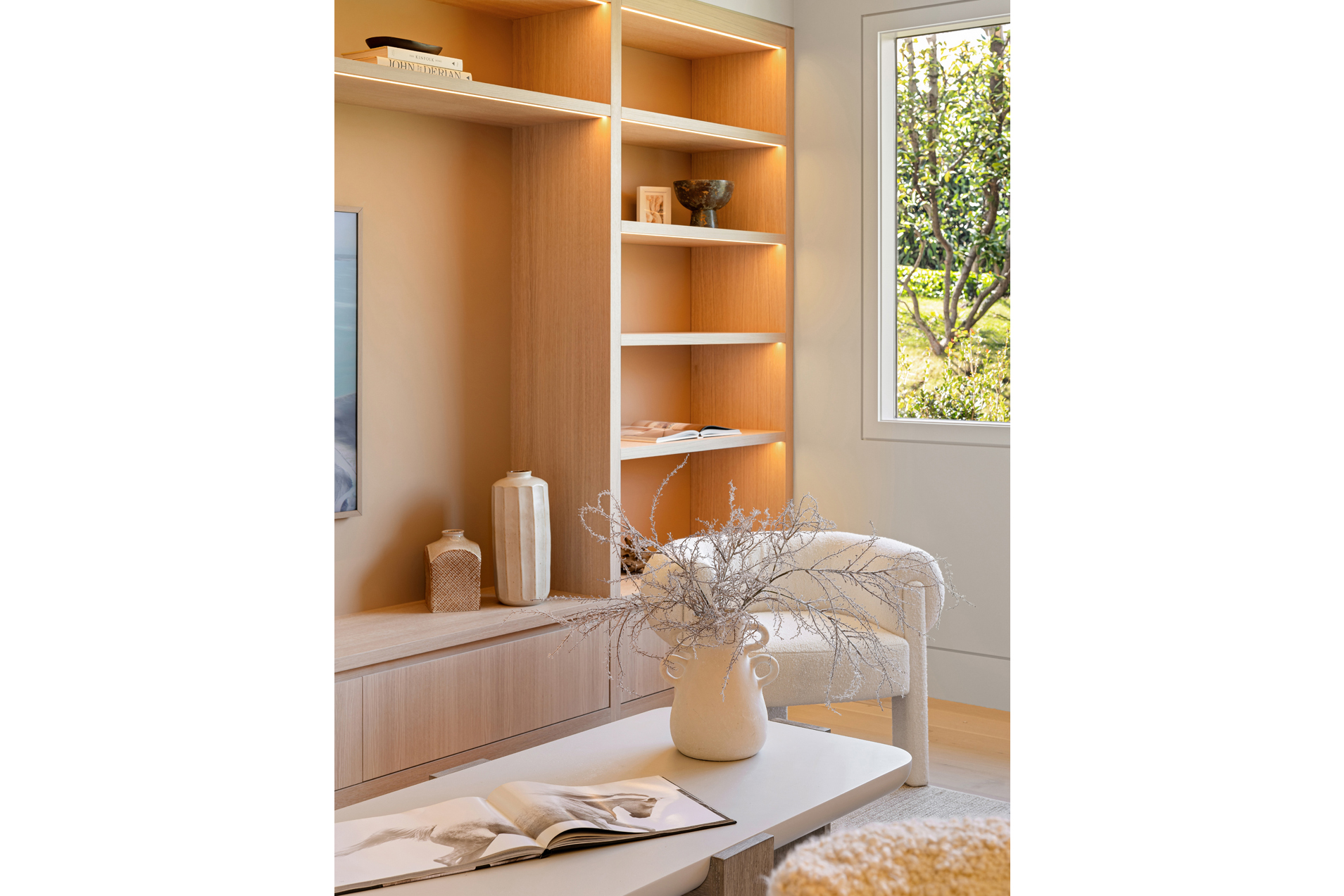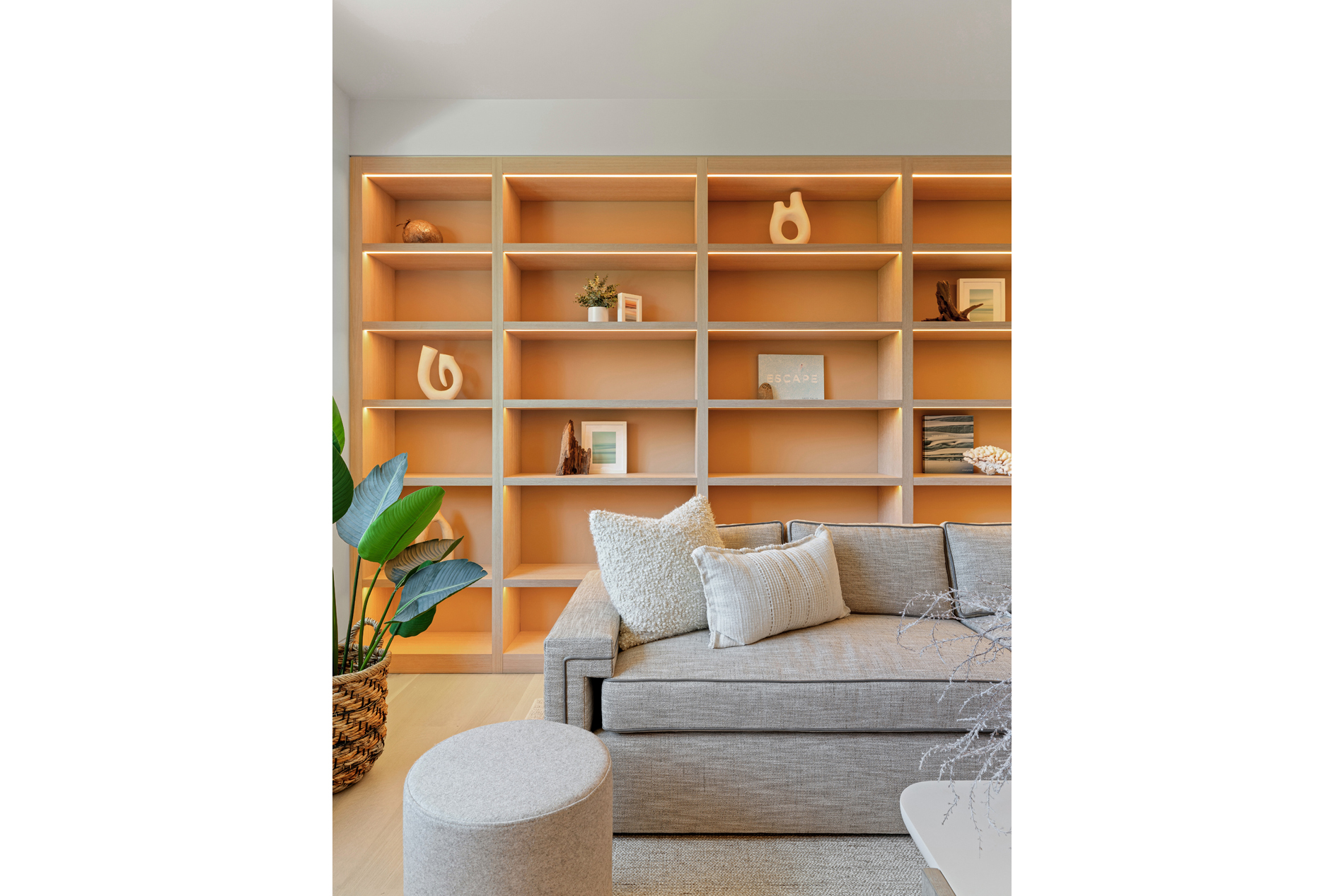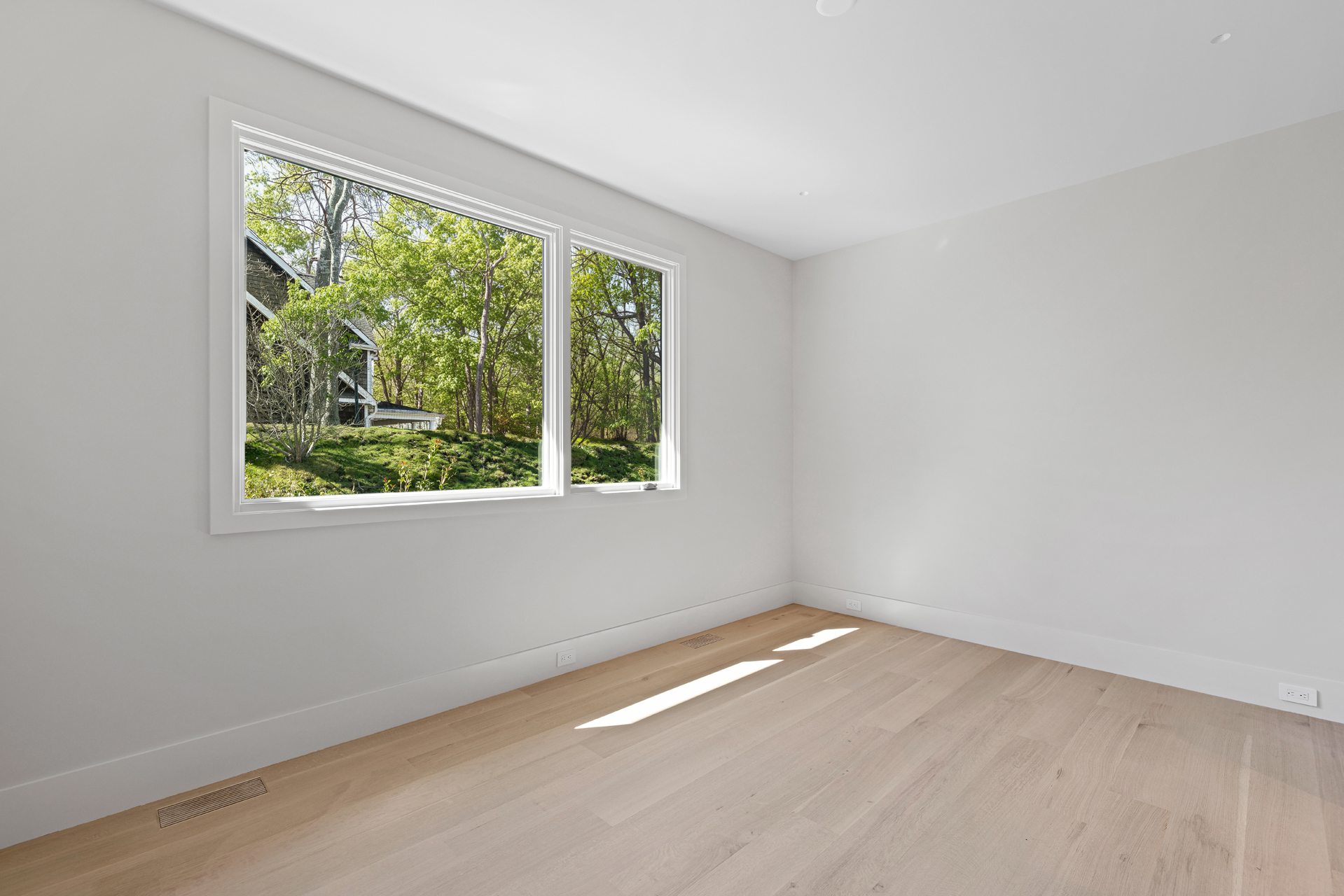 The interior of the home reflects exceptional attention to detail, where each element is thoughtfully designed for both beauty and practicality. The 7” rustic white oak flooring flows throughout, pairing seamlessly with custom Italian plaster walls in the bathrooms, kitchen, and living areas. High ceilings and slim-line aluminum windows invite natural light, enhancing the home’s open, airy feel.