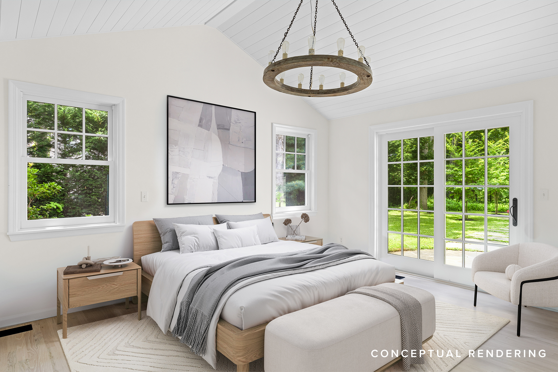 White oak flooring and custom shiplap detailing add warmth throughout, while Marvin and Andersen windows and doors invite natural light into every room, enhancing the relaxed coastal vibe.