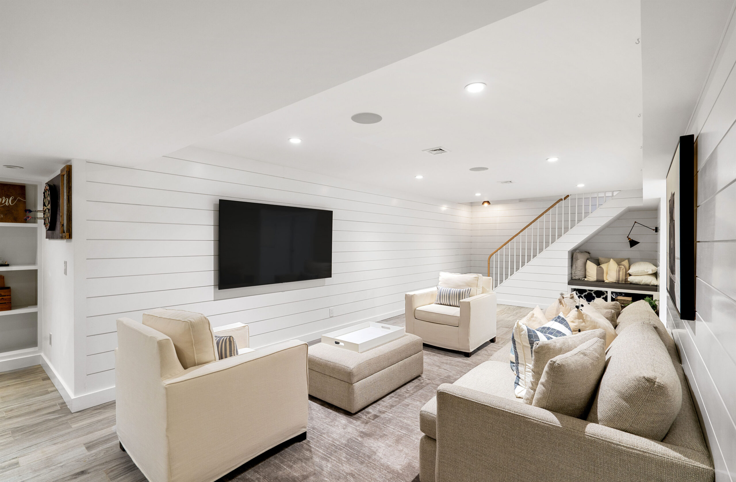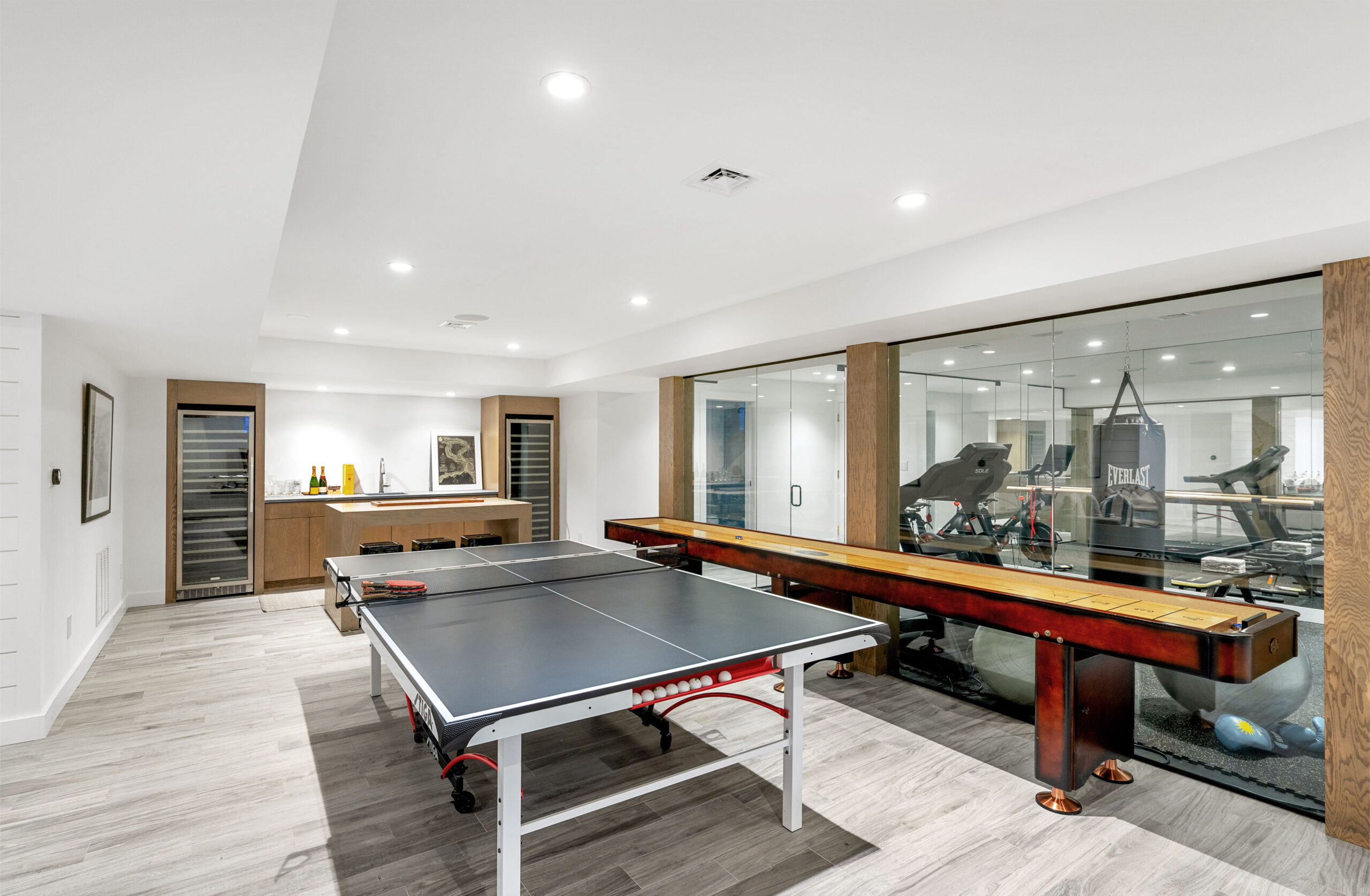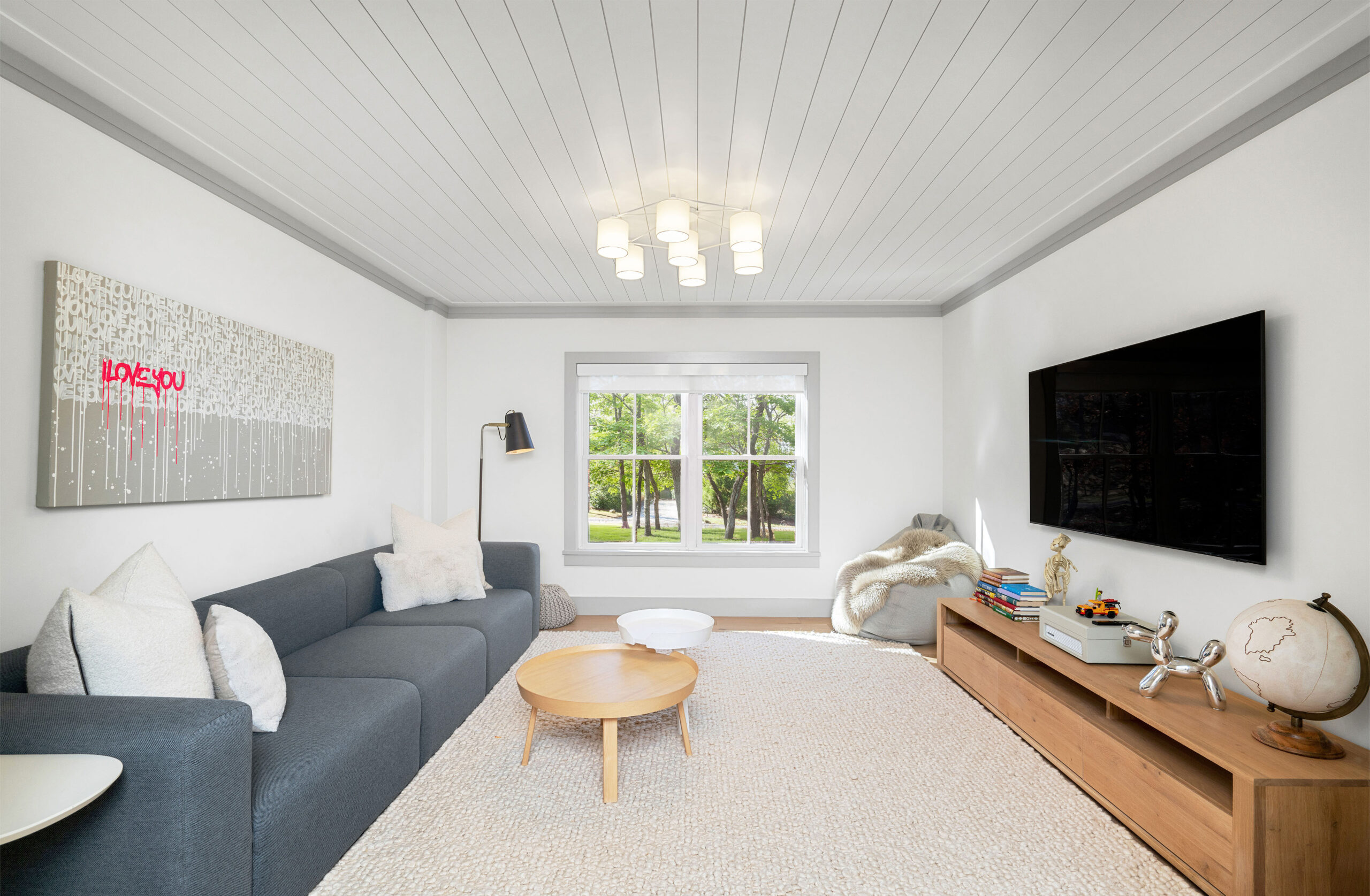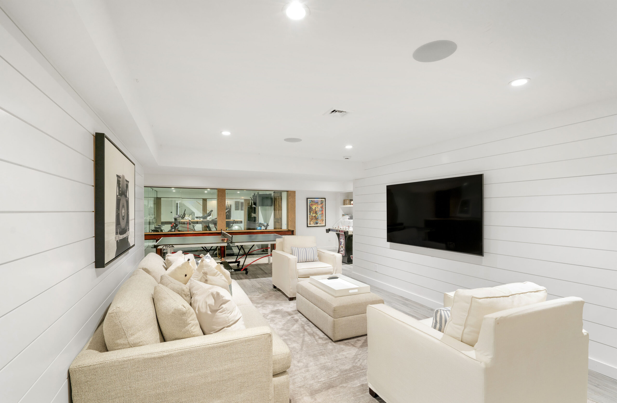 The first level welcomes you with bright, open spaces grounded by wide-plank oak flooring and large windows that draw in natural light. The main living room offers a warm, inviting atmosphere with soft neutral tones and views toward the front grounds. At the center of the home, the open chef’s kitchen stands out with a dramatic waterfall-edge marble island, full-height marble backsplash, and a seamless blend of natural textures and clean architectural lines. Integrated Thermador appliances and sculptural open shelving complete the refined, modern aesthetic. A built-in banquette dining nook provides an additional everyday gathering space. The second level is anchored by the primary suite, featuring vaulted ceilings with exposed beams and a spacious layout. The accompanying primary bathroom offers a floating double vanity, large-format stone surfaces, and a skylit walk-in shower with a slatted wood shower floor for warmth and texture. The lower level is designed as a full recreation and wellness floor, offering multiple areas for relaxation and activity. A spacious playroom with built-in shelving provides an organized setting for games and storage. The adjacent TV lounge features shiplap walls, comfortable seating, and a dedicated media area.