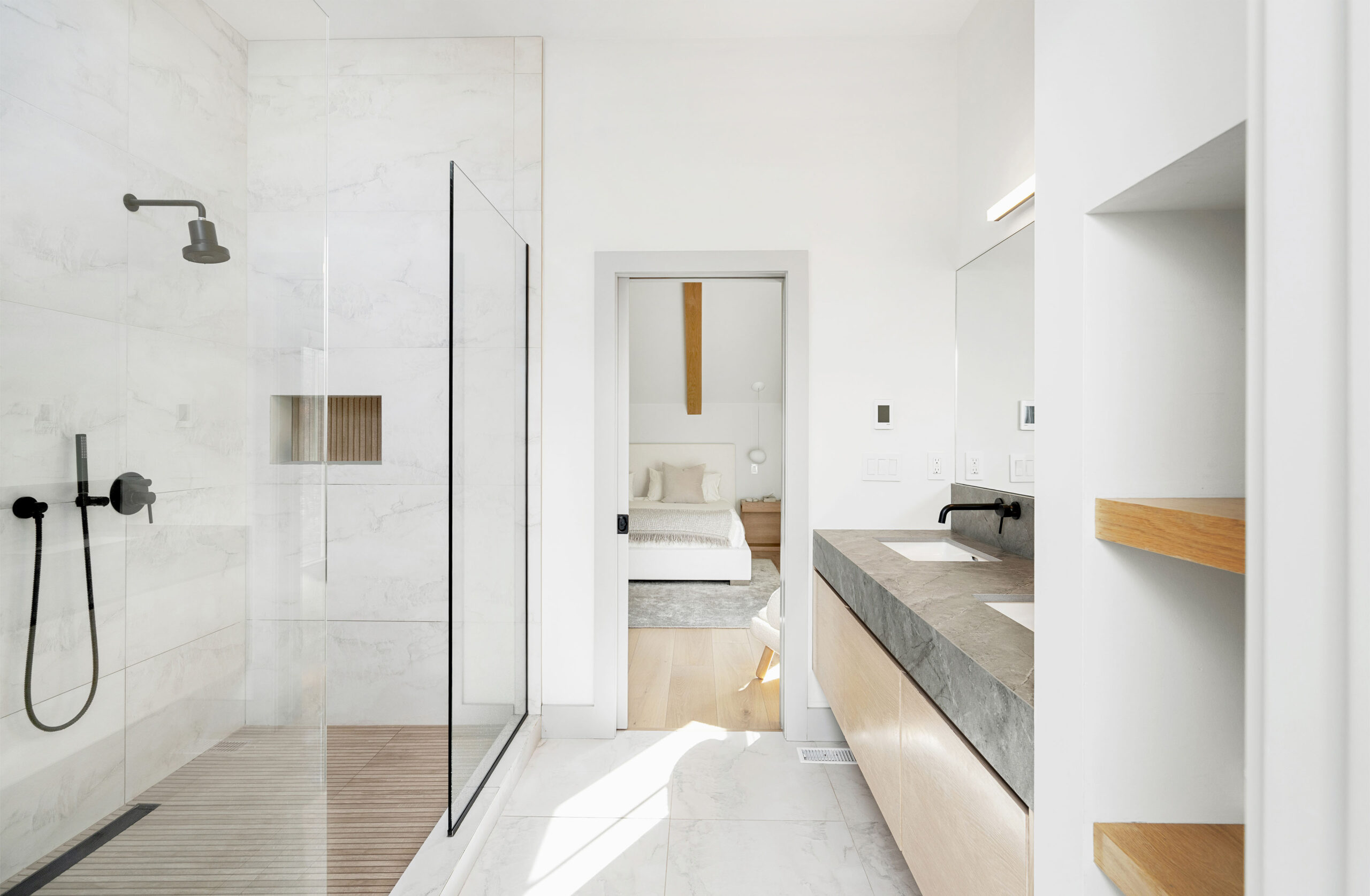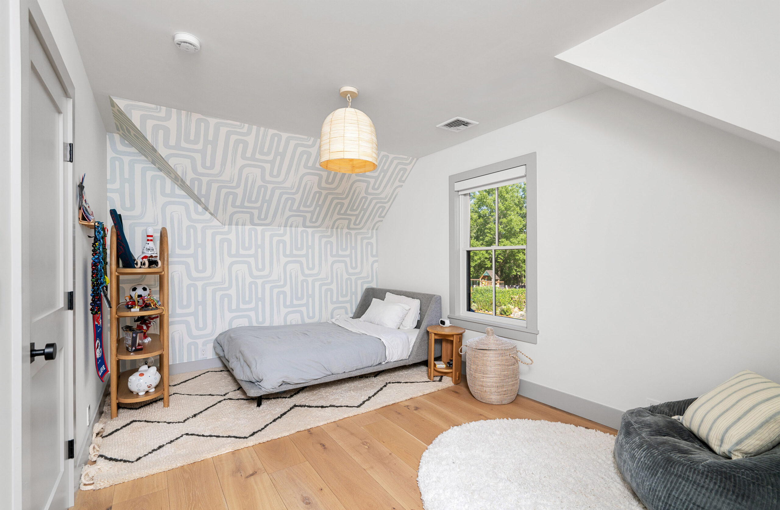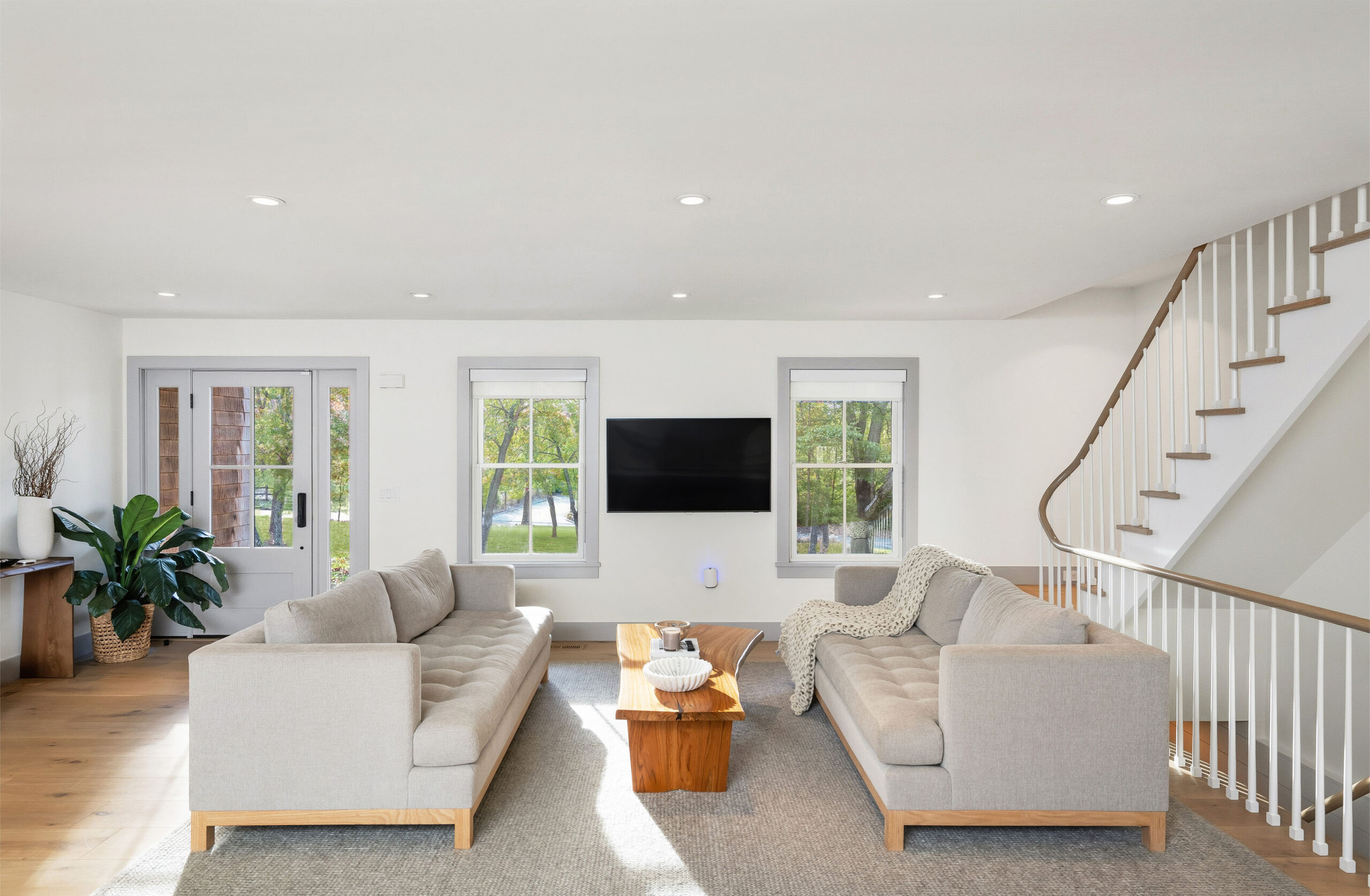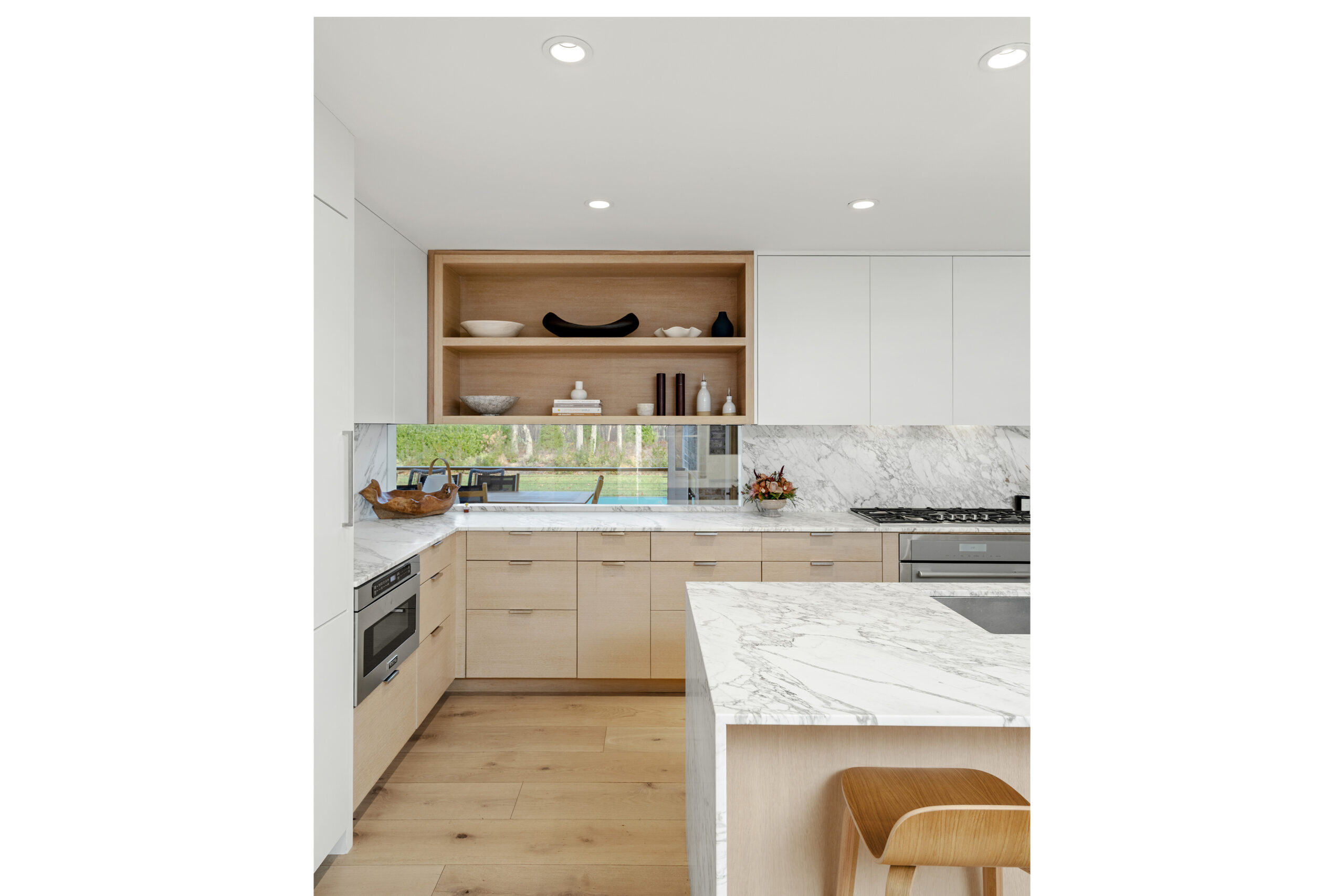 The first level welcomes you with bright, open spaces grounded by wide-plank oak flooring and large windows that draw in natural light. The main living room offers a warm, inviting atmosphere with soft neutral tones and views toward the front grounds. At the center of the home, the open chef’s kitchen stands out with a dramatic waterfall-edge marble island, full-height marble backsplash, and a seamless blend of natural textures and clean architectural lines. Integrated Thermador appliances and sculptural open shelving complete the refined, modern aesthetic. A built-in banquette dining nook provides an additional everyday gathering space. The second level is anchored by the primary suite, featuring vaulted ceilings with exposed beams and a spacious layout. The accompanying primary bathroom offers a floating double vanity, large-format stone surfaces, and a skylit walk-in shower with a slatted wood shower floor for warmth and texture. The lower level is designed as a full recreation and wellness floor, offering multiple areas for relaxation and activity. A spacious playroom with built-in shelving provides an organized setting for games and storage. The adjacent TV lounge features shiplap walls, comfortable seating, and a dedicated media area.