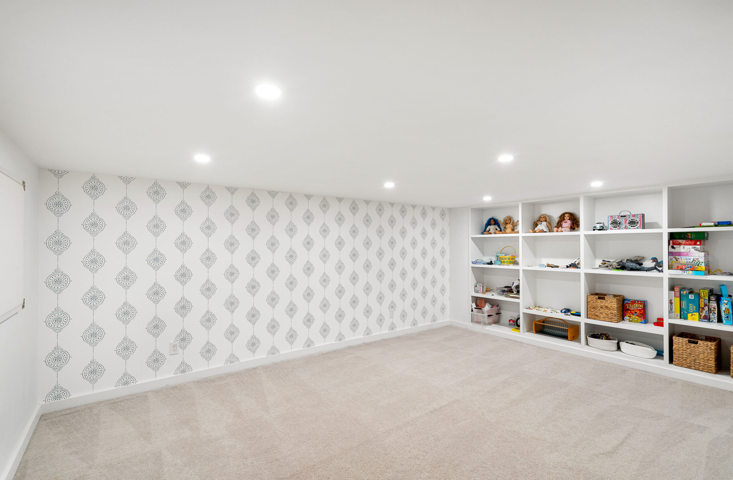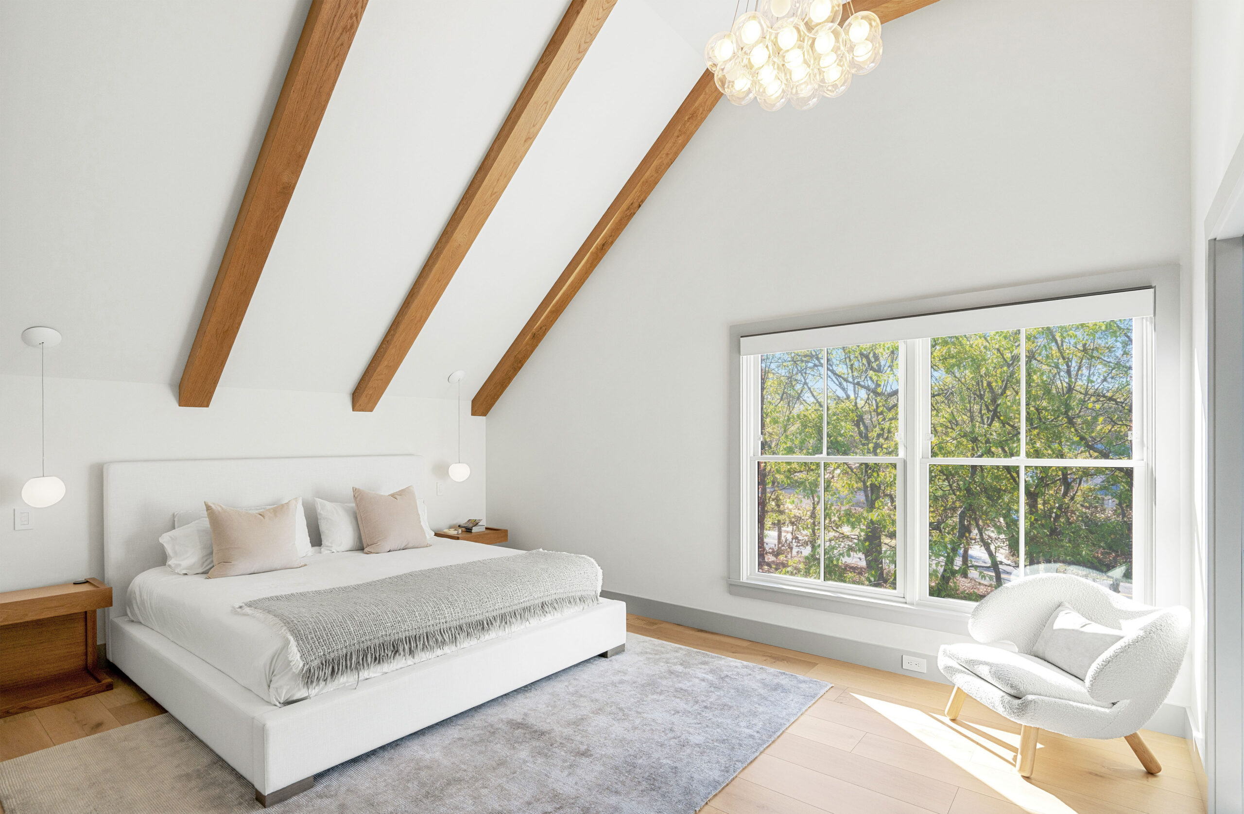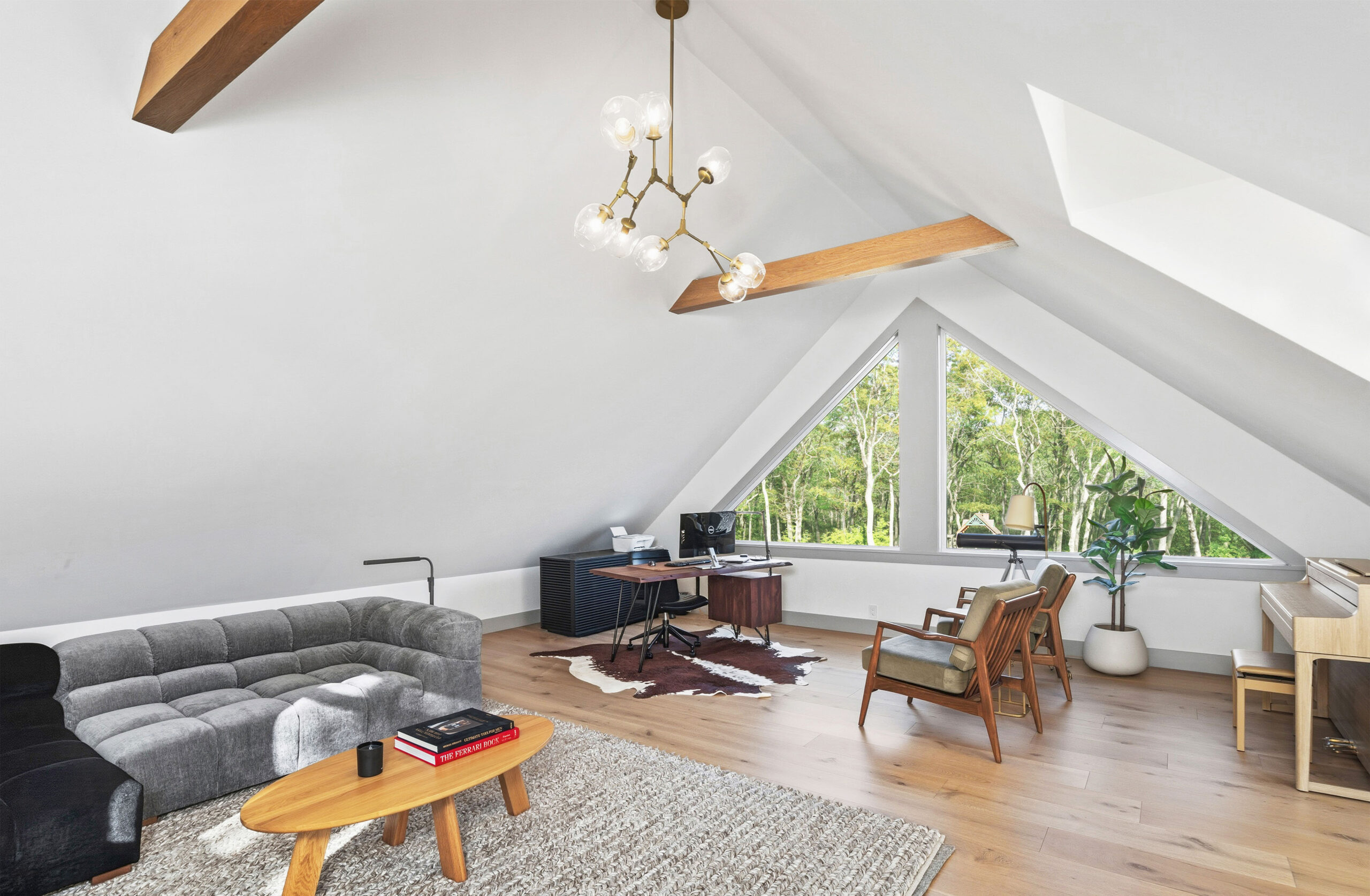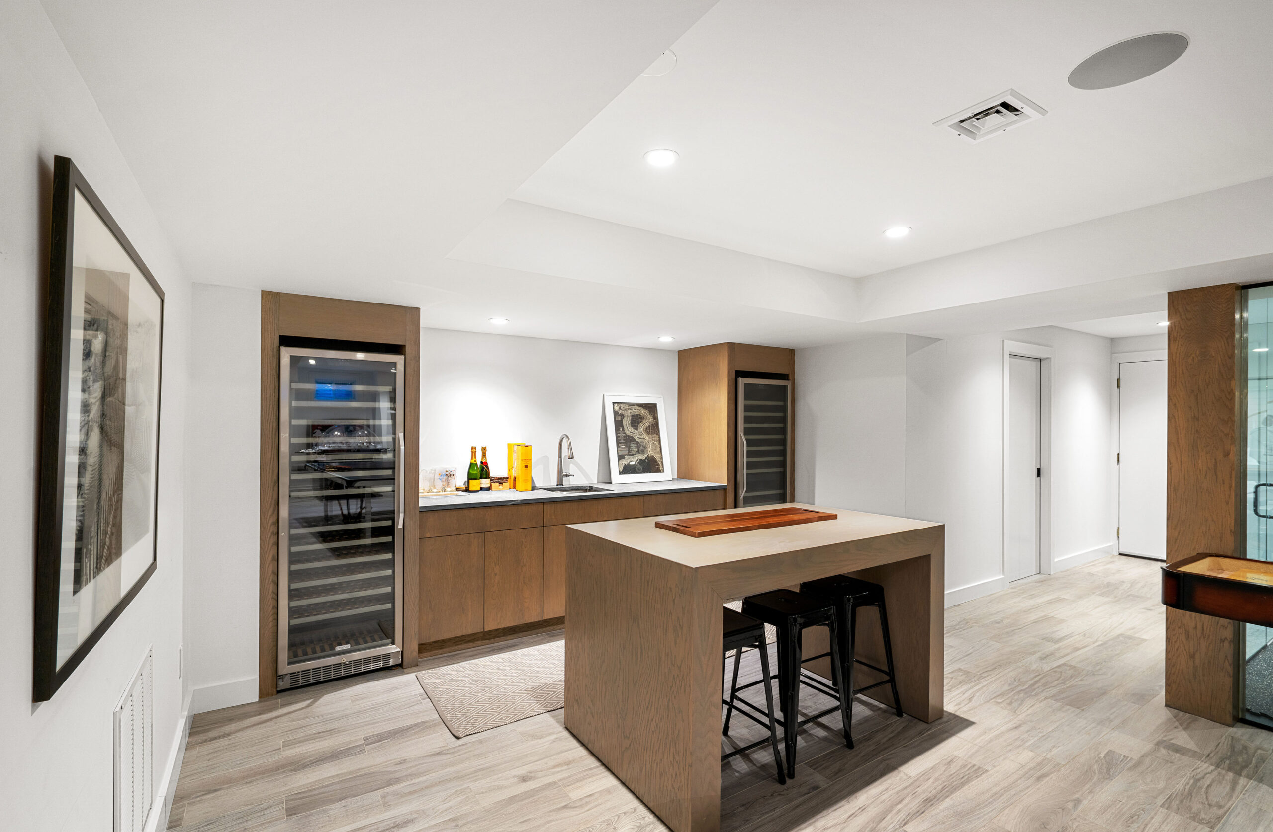 The first level welcomes you with bright, open spaces grounded by wide-plank oak flooring and large windows that draw in natural light. The main living room offers a warm, inviting atmosphere with soft neutral tones and views toward the front grounds. At the center of the home, the open chef’s kitchen stands out with a dramatic waterfall-edge marble island, full-height marble backsplash, and a seamless blend of natural textures and clean architectural lines. Integrated Thermador appliances and sculptural open shelving complete the refined, modern aesthetic. A built-in banquette dining nook provides an additional everyday gathering space. The second level is anchored by the primary suite, featuring vaulted ceilings with exposed beams and a spacious layout. The accompanying primary bathroom offers a floating double vanity, large-format stone surfaces, and a skylit walk-in shower with a slatted wood shower floor for warmth and texture. The lower level is designed as a full recreation and wellness floor, offering multiple areas for relaxation and activity. A spacious playroom with built-in shelving provides an organized setting for games and storage. The adjacent TV lounge features shiplap walls, comfortable seating, and a dedicated media area.