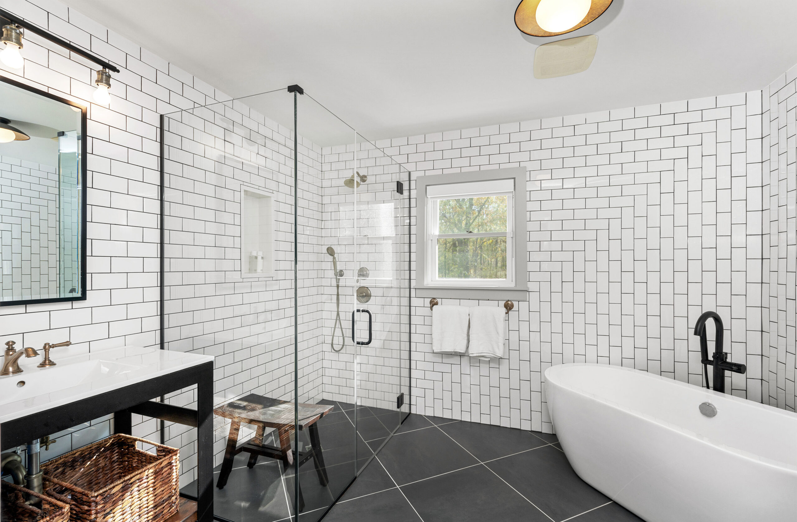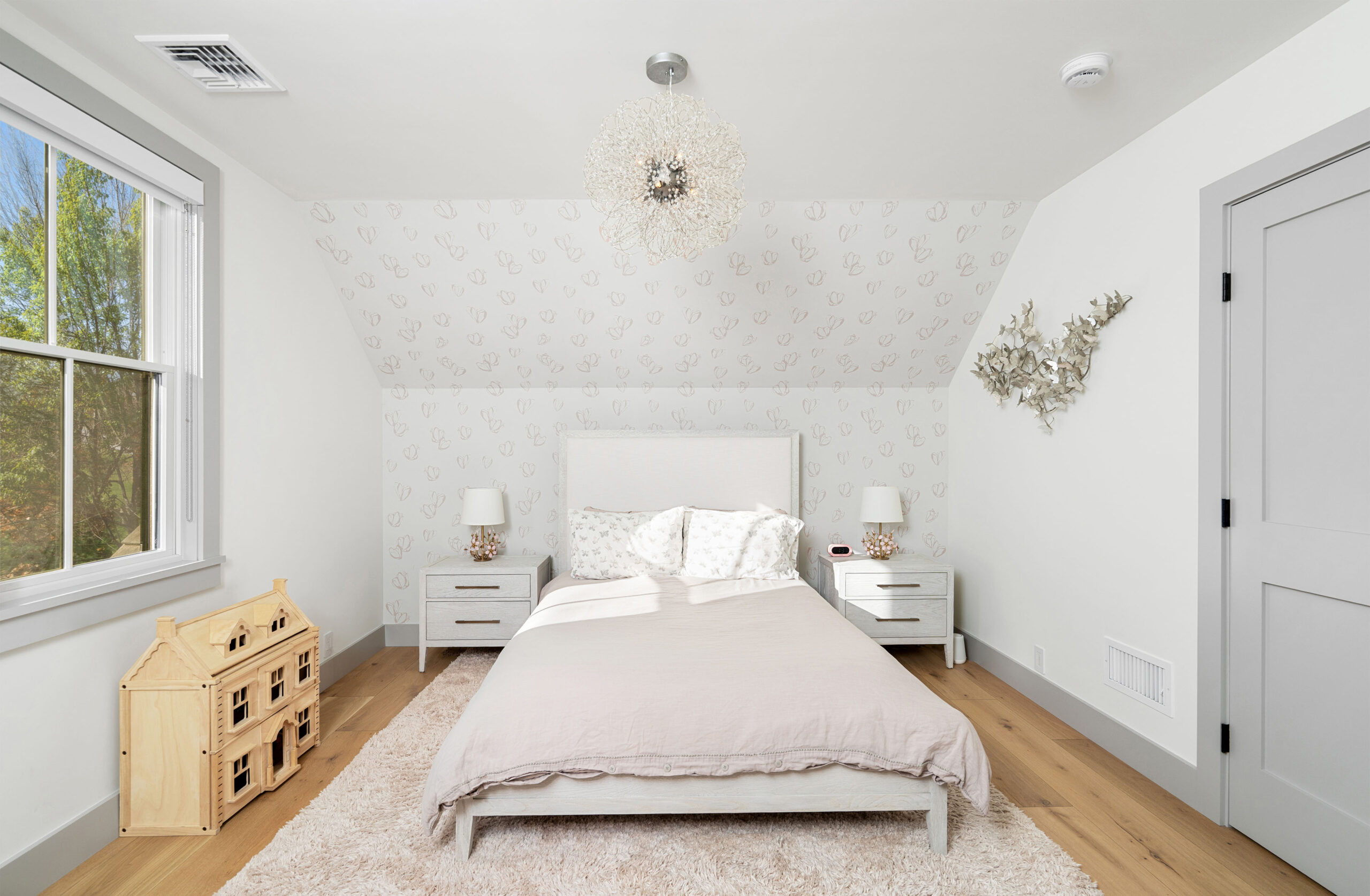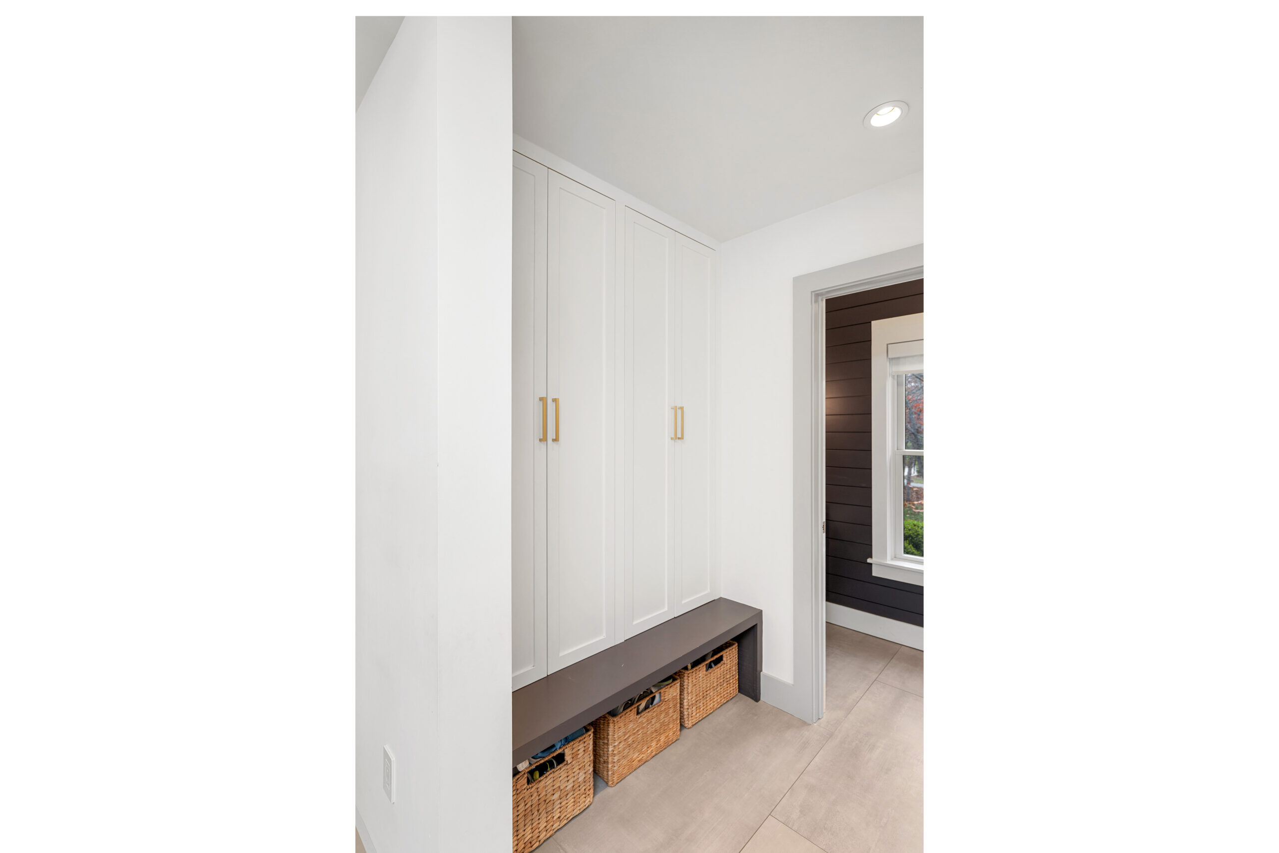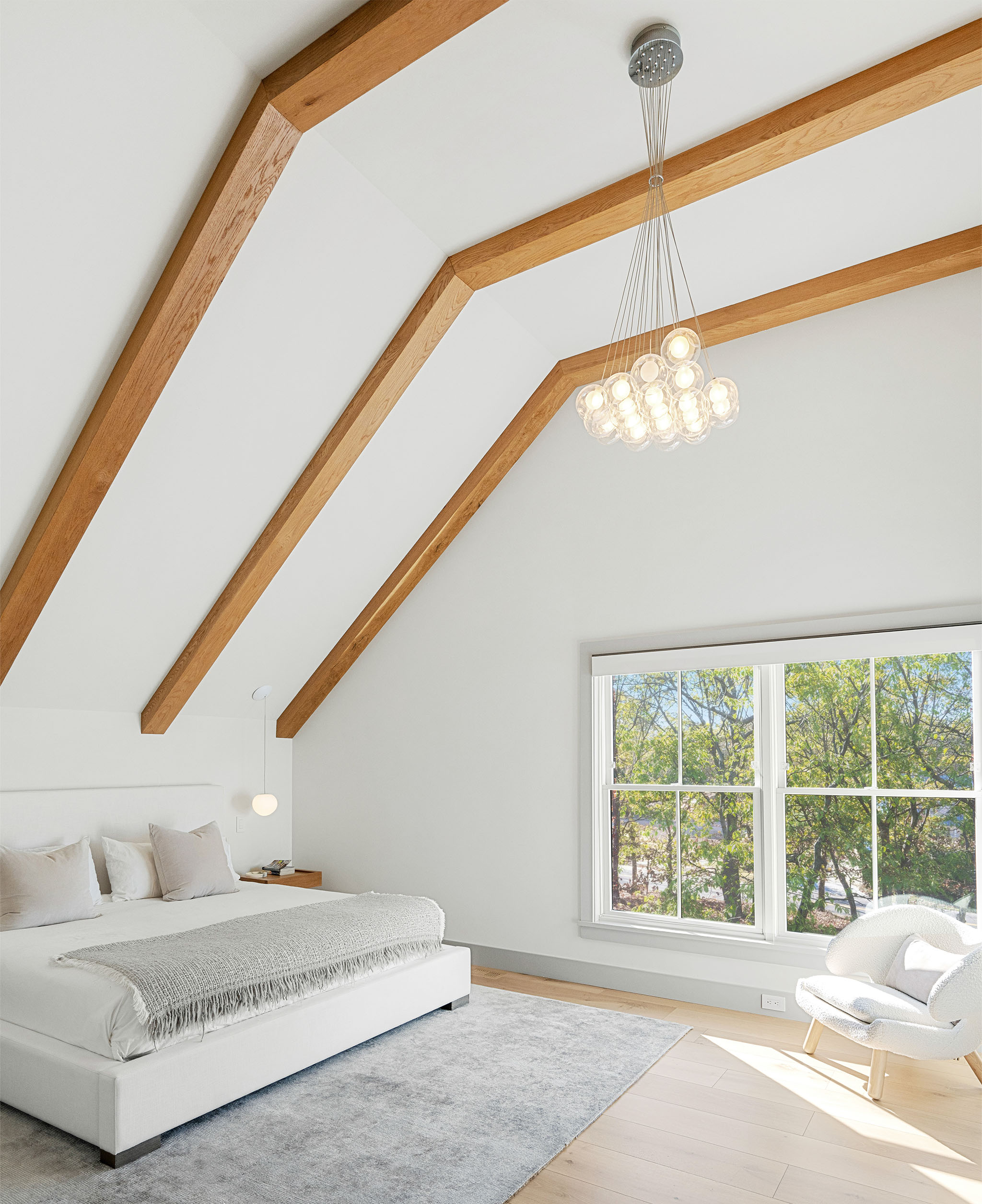 The first level welcomes you with bright, open spaces grounded by wide-plank oak flooring and large windows that draw in natural light. The main living room offers a warm, inviting atmosphere with soft neutral tones and views toward the front grounds. At the center of the home, the open chef’s kitchen stands out with a dramatic waterfall-edge marble island, full-height marble backsplash, and a seamless blend of natural textures and clean architectural lines. Integrated Thermador appliances and sculptural open shelving complete the refined, modern aesthetic. A built-in banquette dining nook provides an additional everyday gathering space. The second level is anchored by the primary suite, featuring vaulted ceilings with exposed beams and a spacious layout. The accompanying primary bathroom offers a floating double vanity, large-format stone surfaces, and a skylit walk-in shower with a slatted wood shower floor for warmth and texture. The lower level is designed as a full recreation and wellness floor, offering multiple areas for relaxation and activity. A spacious playroom with built-in shelving provides an organized setting for games and storage. The adjacent TV lounge features shiplap walls, comfortable seating, and a dedicated media area.